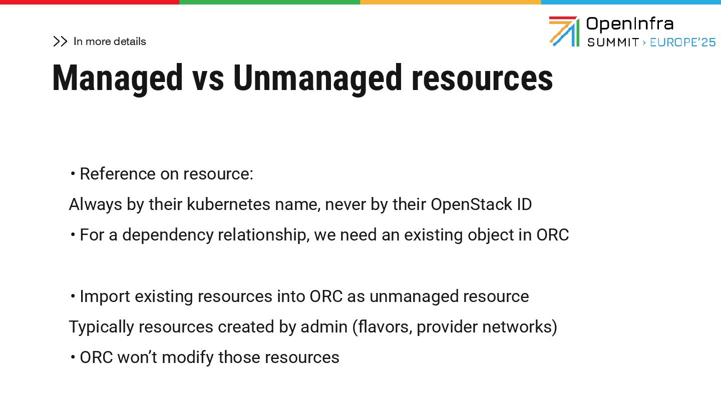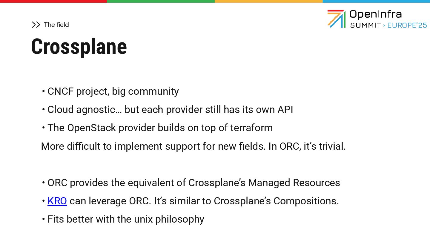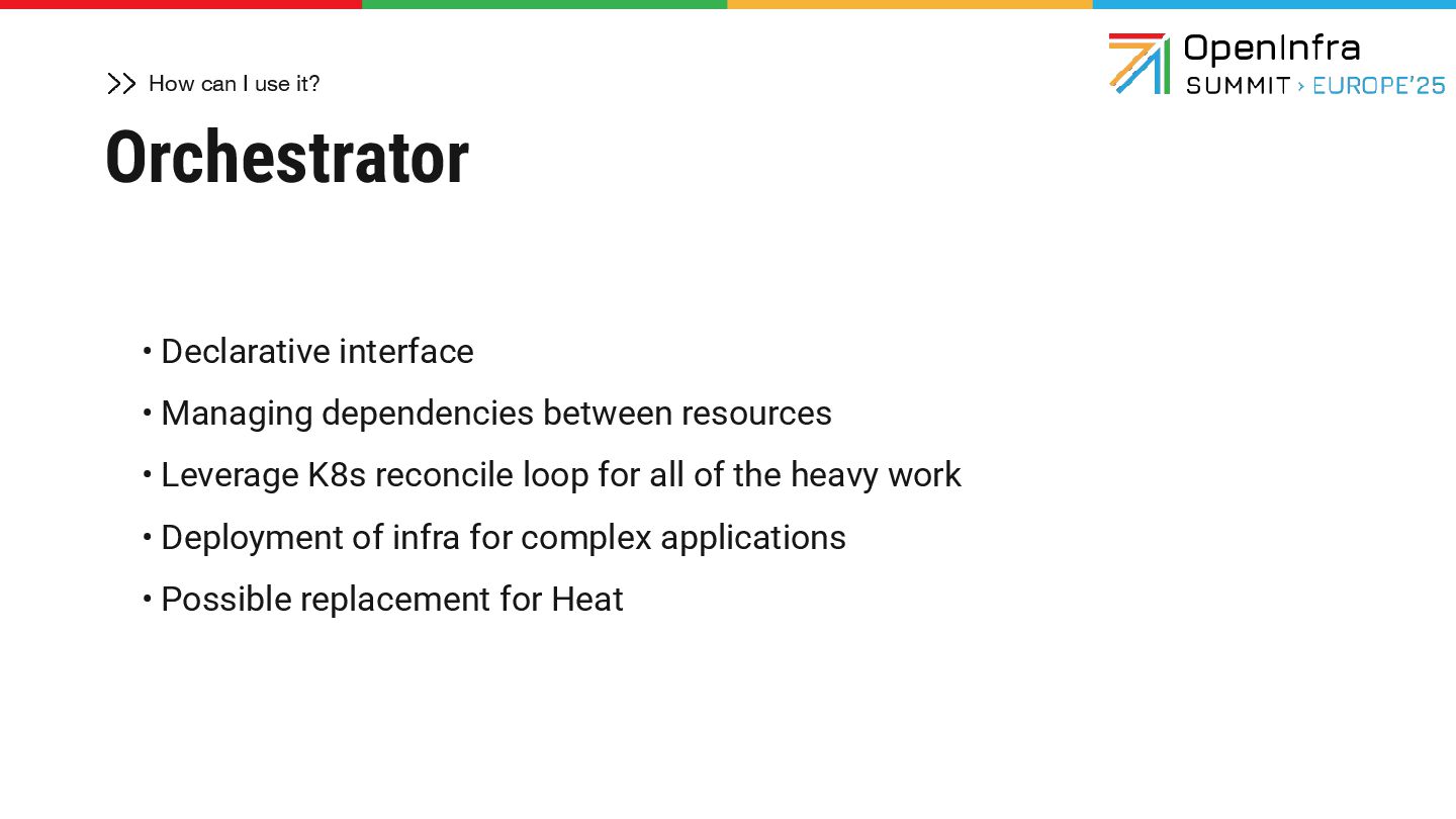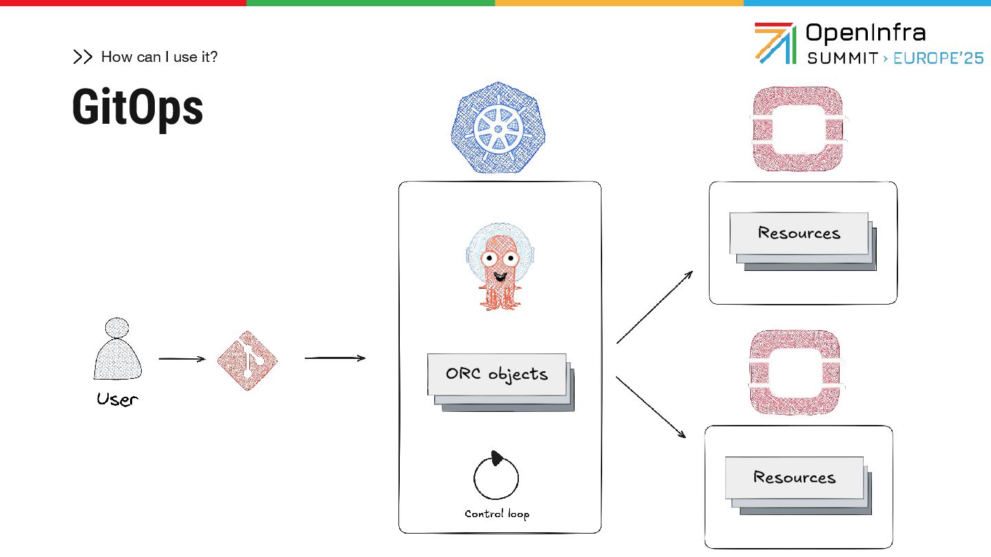 Managing OpenStack resources efficiently can be complex, especially when striving for cloud-native agility and GitOps workflows. In this talk, we'll introduce the OpenStack Resource Controller (ORC), a powerful solution combining the benefits of Kubernetes Custom Resource Definitions (CRDs) and controllers with OpenStack’s rich and mature APIs and application ecosystem. We'll explore ORC's fundamental "raison d'être," highlighting how it directly addresses common provisioning pain points many developers and operators face. We’ll compare ORC against “the competition”, exploring both its strengths and weaknesses. Discover its core goals, design philosophy, and how ORC simplifies the declarative management of your OpenStack infrastructure, enabling seamless resource orchestration for modern cloud-native applications.