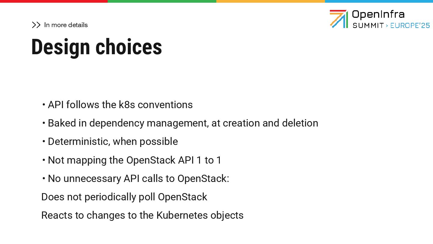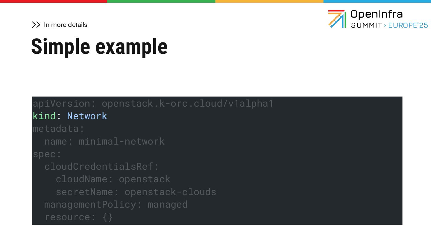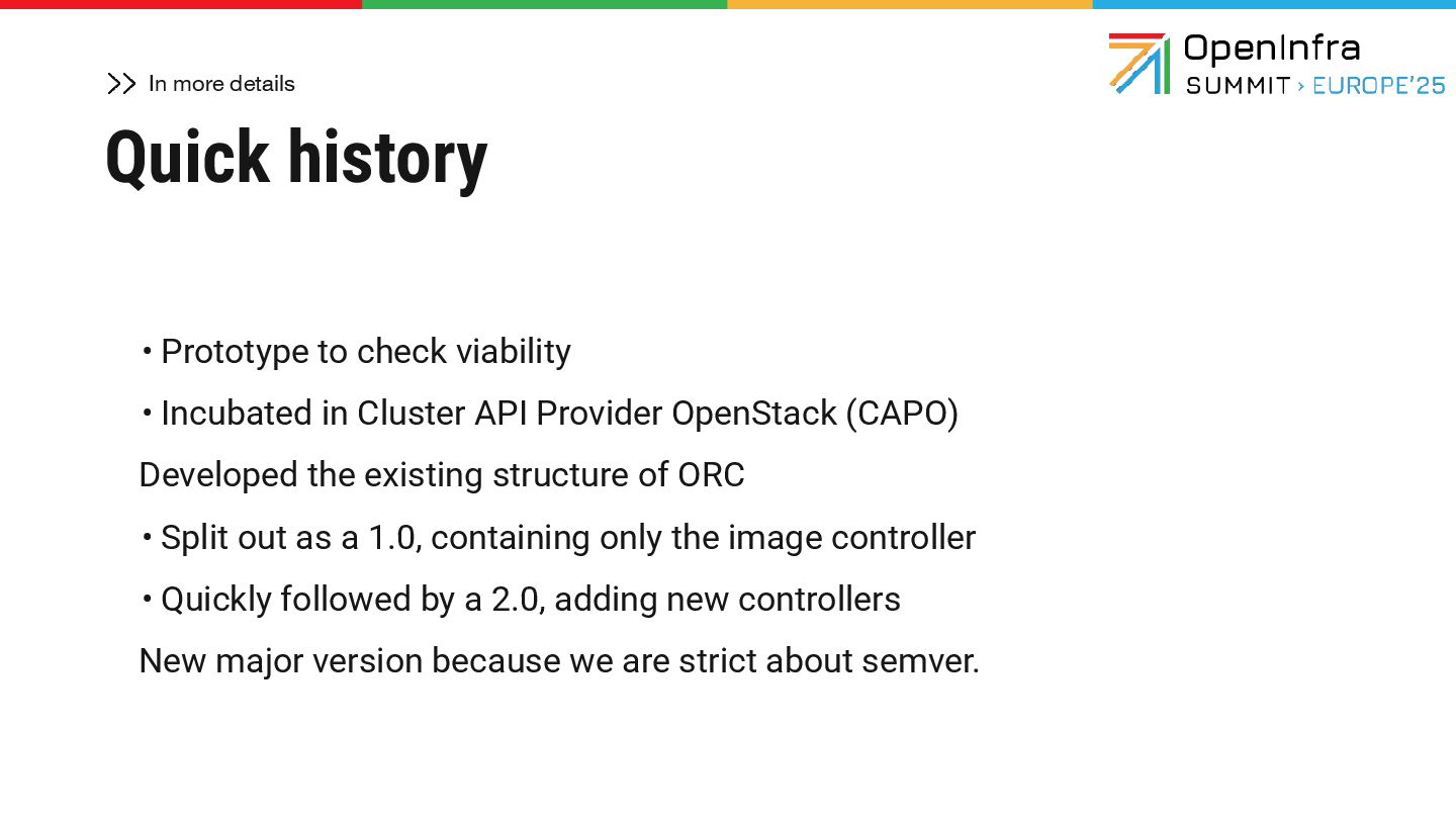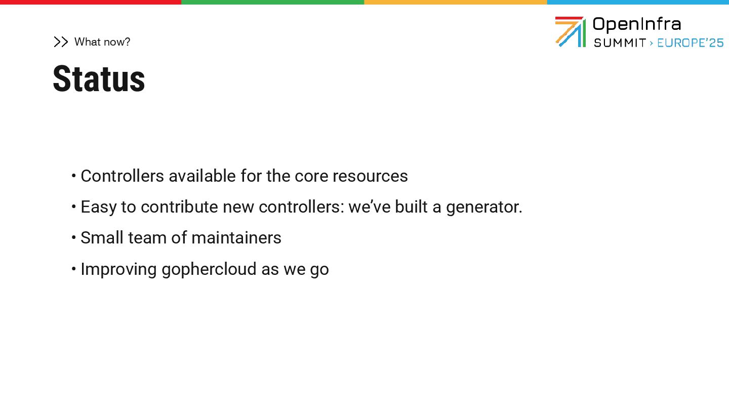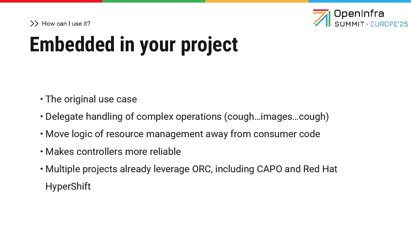 Managing OpenStack resources efficiently can be complex, especially when striving for cloud-native agility and GitOps workflows. In this talk, we'll introduce the OpenStack Resource Controller (ORC), a powerful solution combining the benefits of Kubernetes Custom Resource Definitions (CRDs) and controllers with OpenStack’s rich and mature APIs and application ecosystem. We'll explore ORC's fundamental "raison d'être," highlighting how it directly addresses common provisioning pain points many developers and operators face. We’ll compare ORC against “the competition”, exploring both its strengths and weaknesses. Discover its core goals, design philosophy, and how ORC simplifies the declarative management of your OpenStack infrastructure, enabling seamless resource orchestration for modern cloud-native applications.