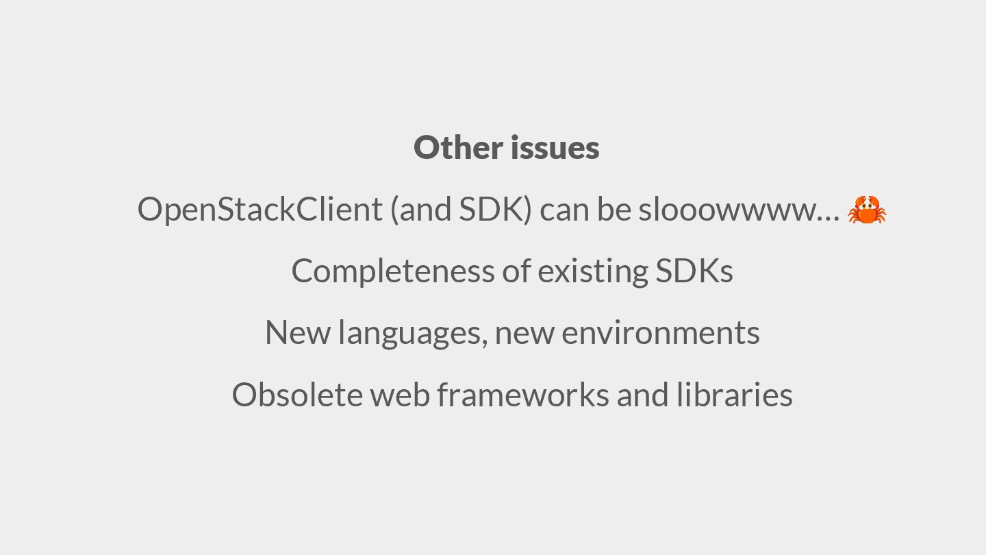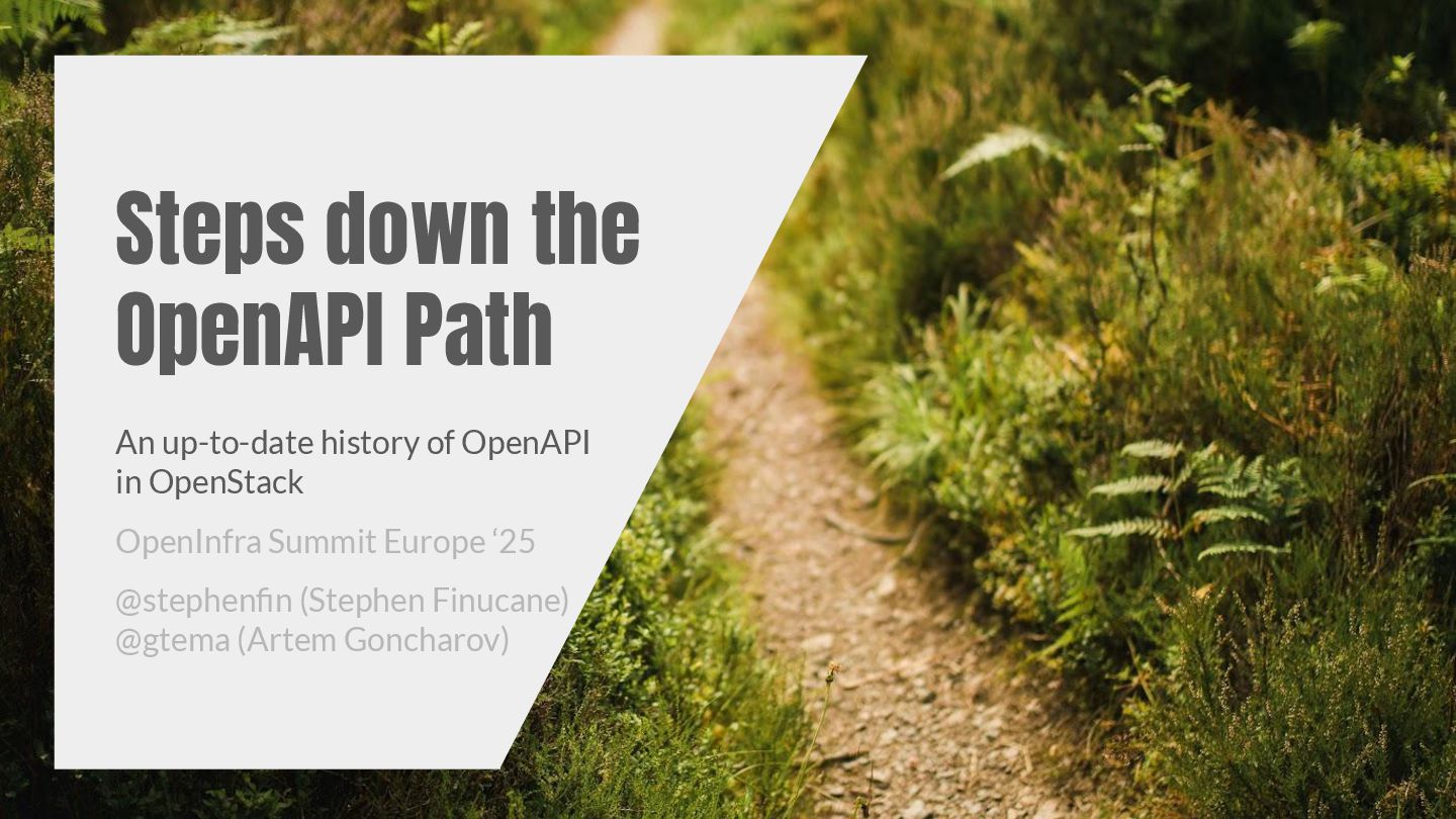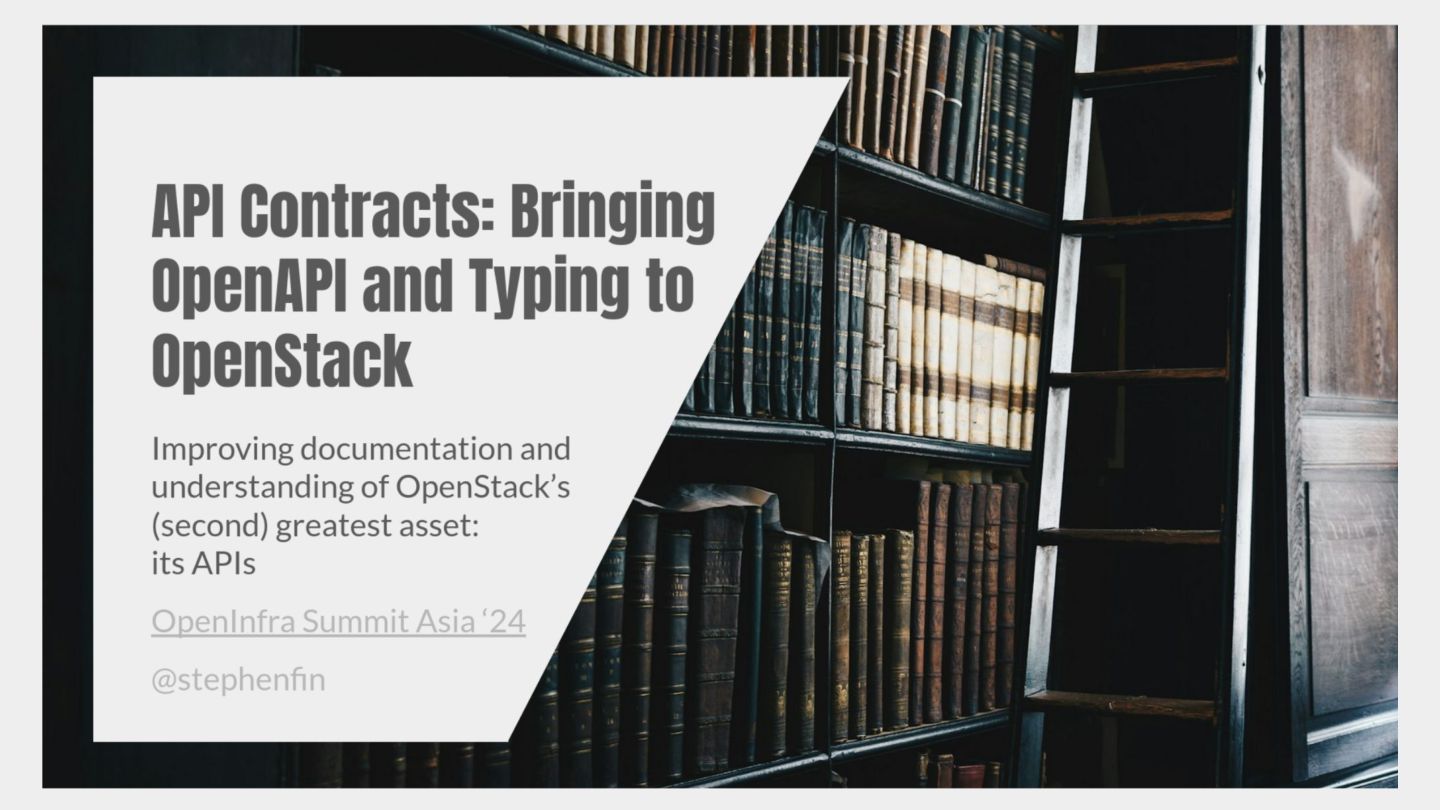 OpenStack has been on a journey towards implementing formal OpenAPI v3.1 API specifications for all services for a number of releases now. We have many goals - better understanding our APIs, improving our documentation, easing client and library development, etc. - and we are finally delivering on many of these. Come learn about the milestones we’ve reached to date, and the benefits we’re already seeing from these efforts, and our plans for the next . We’ll talk about the complexities of implementing common functionality across services with vastly different APIs and stacks, the cool/horrifying things we’ve (re)discovered about our APIs, and the oxidation of our clients. We’ll also demonstrate some of the fruits of our labours and discuss how you, as a user, deployer, or contributor, can get involved in the effort.