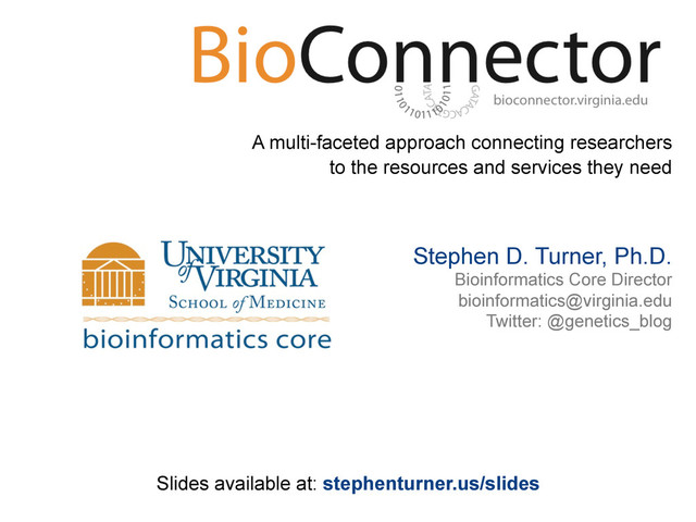 biological research • Bioinformatics toolkit • Workflow management system • Facilitates transparency, reproducibility, sharing • Regular workshops in HSL (slides at stephenturner.us/slides) wiki.bioconnector.virginia.edu • A simple-to-use wiki, aimed at creating documentation. • 75 registered users • Can be used by service providers (Bioinformatics Core, Clinical Informatics, HSL) to easily document and share data/ methods/results with clients and collaborators.