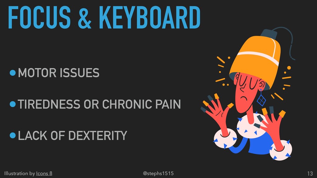 4. FOCUS & KEYBOARD 13 •MOTOR ISSUES •TIREDNESS OR CHRONIC PAIN
