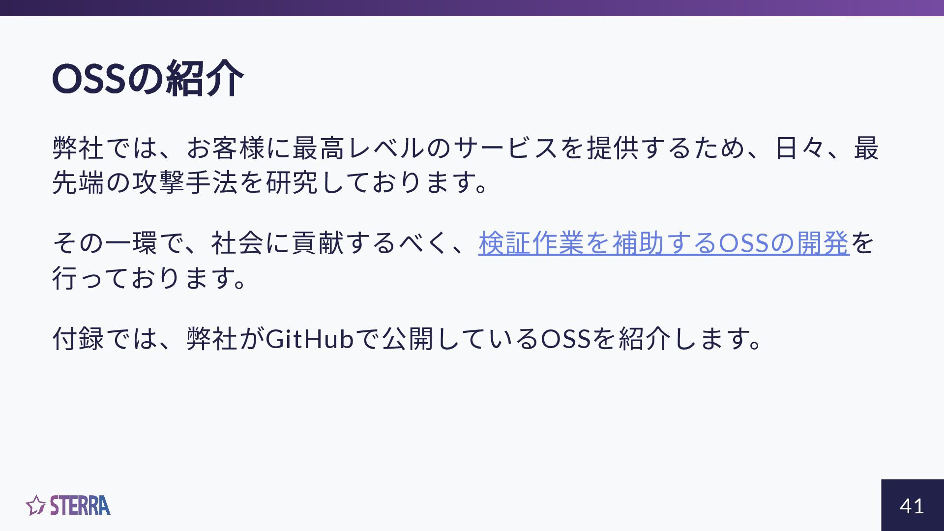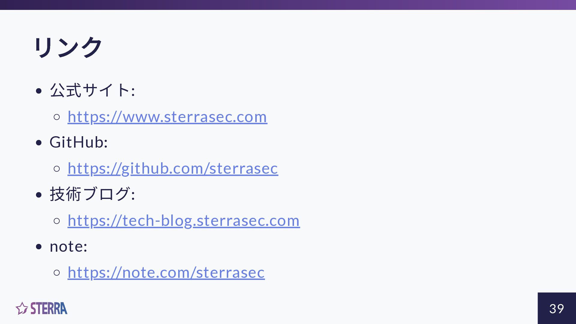 - 公式サイト: - https://www.sterrasec.com - GitHub: - https://github.com/sterrasec - 技術ブログ: - https://tech-blog.sterrasec.com