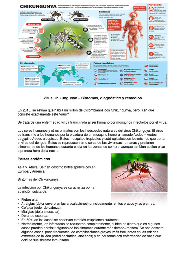 a sentirse mejor después de 7 a 10 días contagiado. Es frecuente el infradiagnóstico de la fiebre del Chikunguya, ya que a menudo solo se manifiesta con síntomas leves y pasa desapercibida, llegando en algunos casos a confundirse con el Dengue. Diagnóstico El diagnóstico del Chikunguya se basa en los signos y síntomas antes mencionados, y se confirma después de un análisis de sangre. Período de incubación (intervalo entre la infección y el desarrollo de los síntomas): Entre 3 a 7 días después de la picadura y con un rango máximo de 1 a 12 días. Periodo infeccioso (tiempo durante el cual una persona infectada puede contagiar a otras personas): El Virus Chikungunya no se puede transmitir directamente de una persona a otra. Remedios No existe un tratamiento específico para la infección del Chikungunya. Se realiza tratamiento sintomático, con intención de aliviar algunos síntomas como pueden ser la fiebre, dolores articulares,. Prevención Es muy recomendable que las personas infectadas eviten las picaduras de mosquitos mientras no se sientan bien. Algunas medidas son utilizar repelente de insectos, usar mangas largas y pantalones, y permanecer en lugares con aire acondicionado. Todavía no existe ninguna vacuna para prevenir la infección. La protección personal y la gestión ambiental de los mosquitos son claves para la prevención de la enfermedad. fuente: http://tusintoma.com/virus-chikungunya/