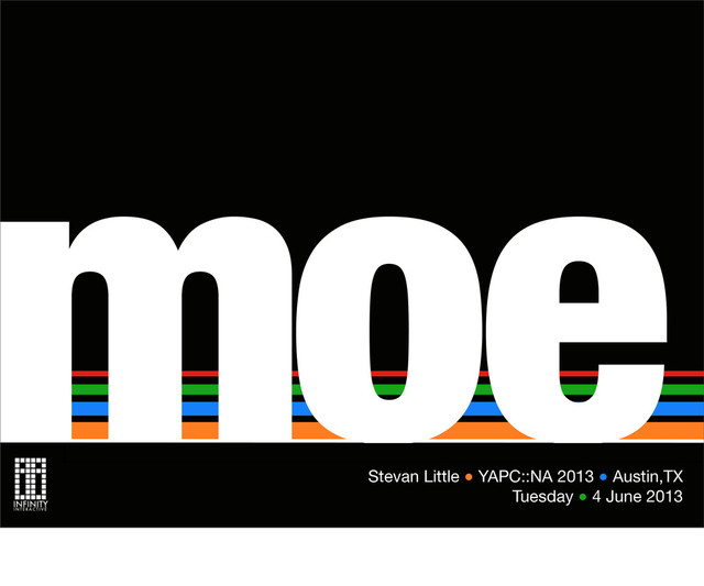 be a way forward. Moe is an attempt to show a way forward, not be a way forward. So keeping that in mind, I want to make a point here. I am not trying to port Perl to the JVM, or usurp Perl 6, I am simply trying to imagine what Perl 5 would look like it if evolved a little more, but not so much as Perl 6. I want to see if I can’t find a language middle ground that will bring some of the goodness that Perl 6 has, but still feel comfortable in the hands of a Perl 5 programmer.