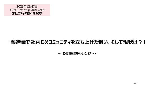 Date: 「製造業で社内DXコミュニティを立ち上げた狙い、そして現状は?」 ~ DX推進チャレンジ ~ 2023年12月7日 #CMC_Meetup 福岡 Vol.9 コミュニティの様々なカタチ
