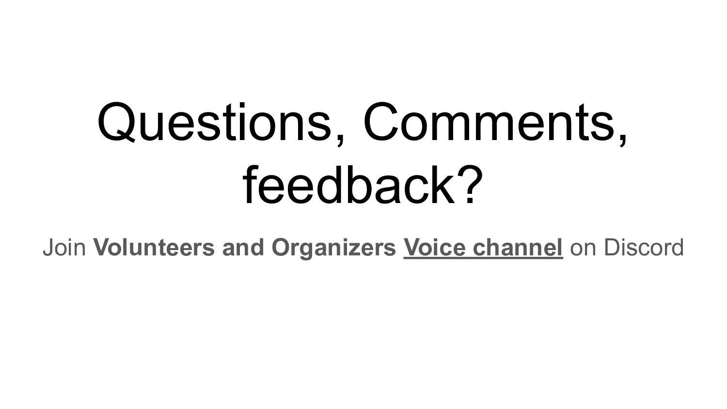 Questions, Comments, feedback? Join Volunteers and Organizers Voice channel on