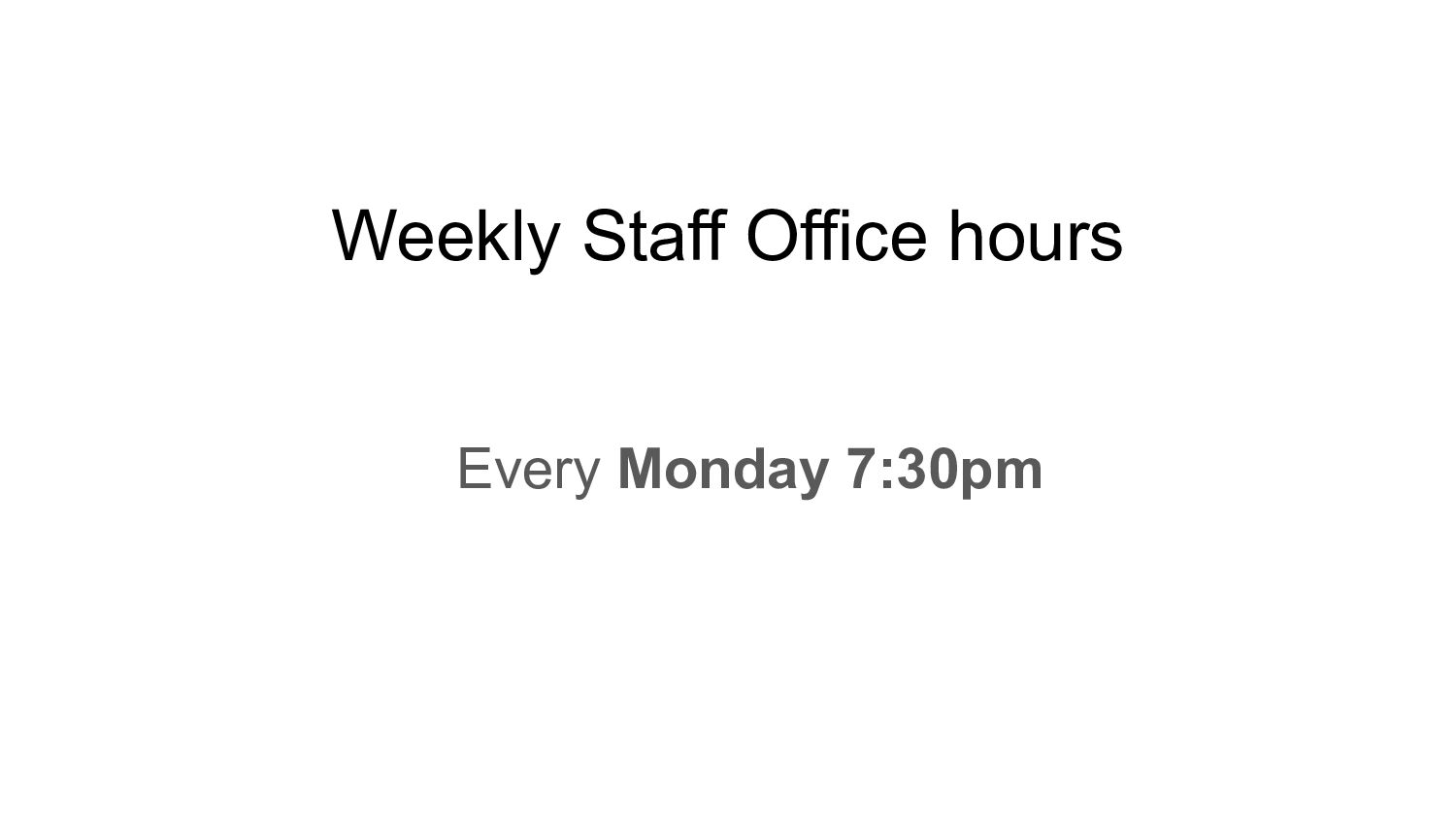 Weekly Staff Office hours Every Monday 7:30pm