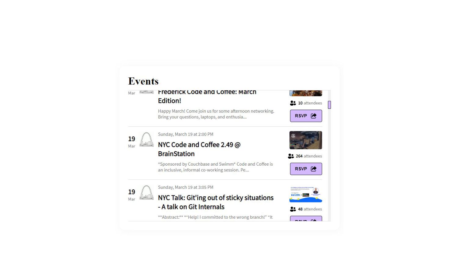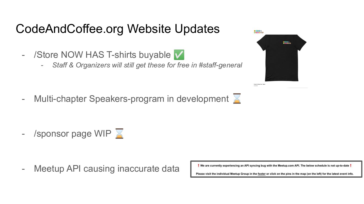 Organizers will still get these for free in #staff-general - Multi-chapter Speakers-program in development ⌛ - /sponsor page WIP ⌛ - Meetup API causing inaccurate data CodeAndCoffee.org Website Updates