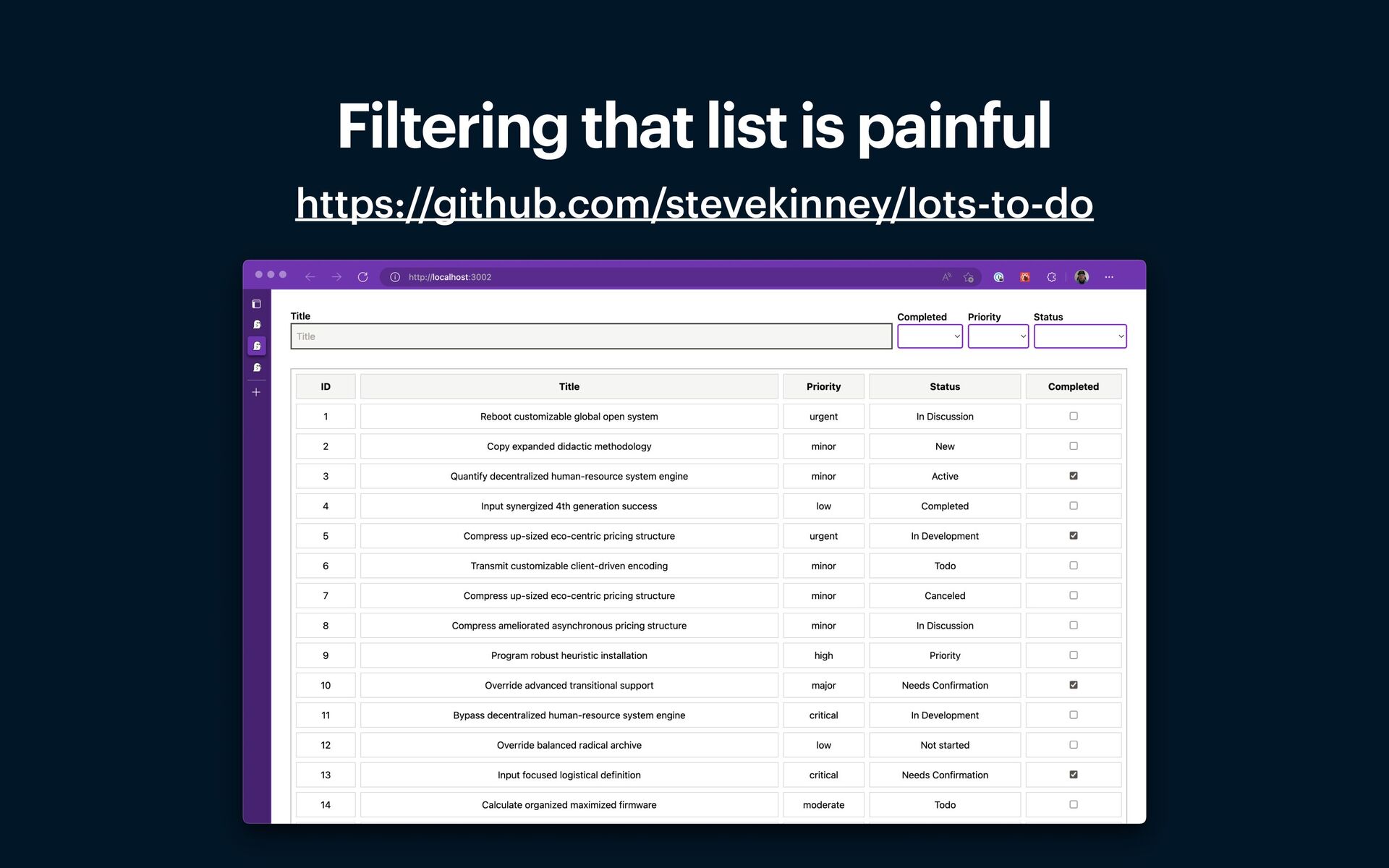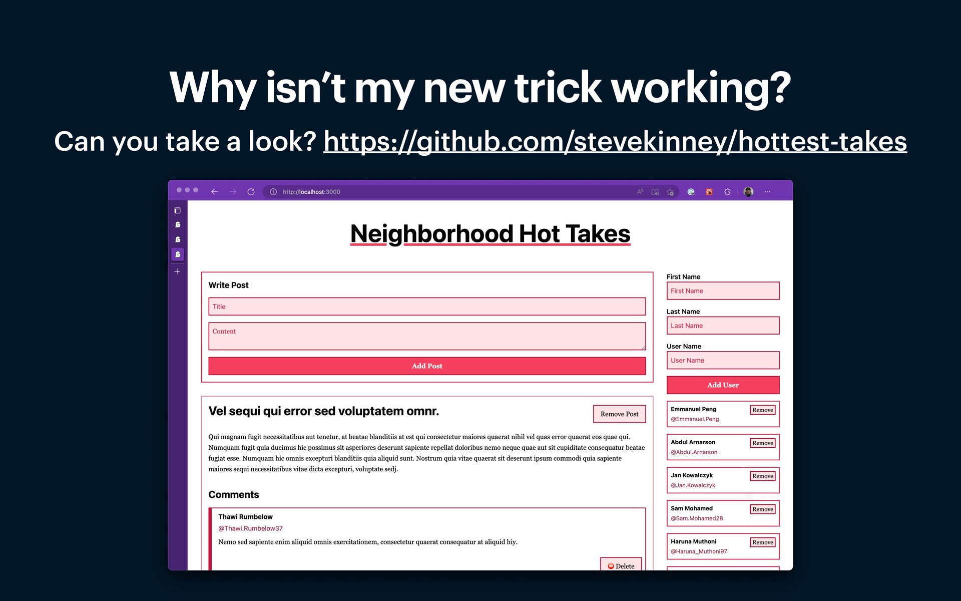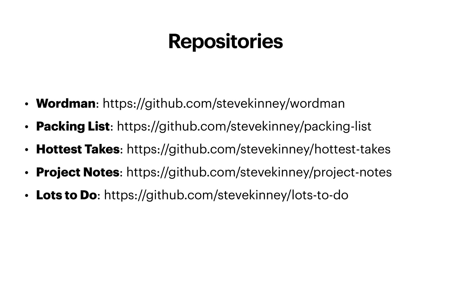 Takes: https://github.com/stevekinney/hottest-takes • Project Notes: https://github.com/stevekinney/project-notes • Lots to Do: https://github.com/stevekinney/lots-to-do