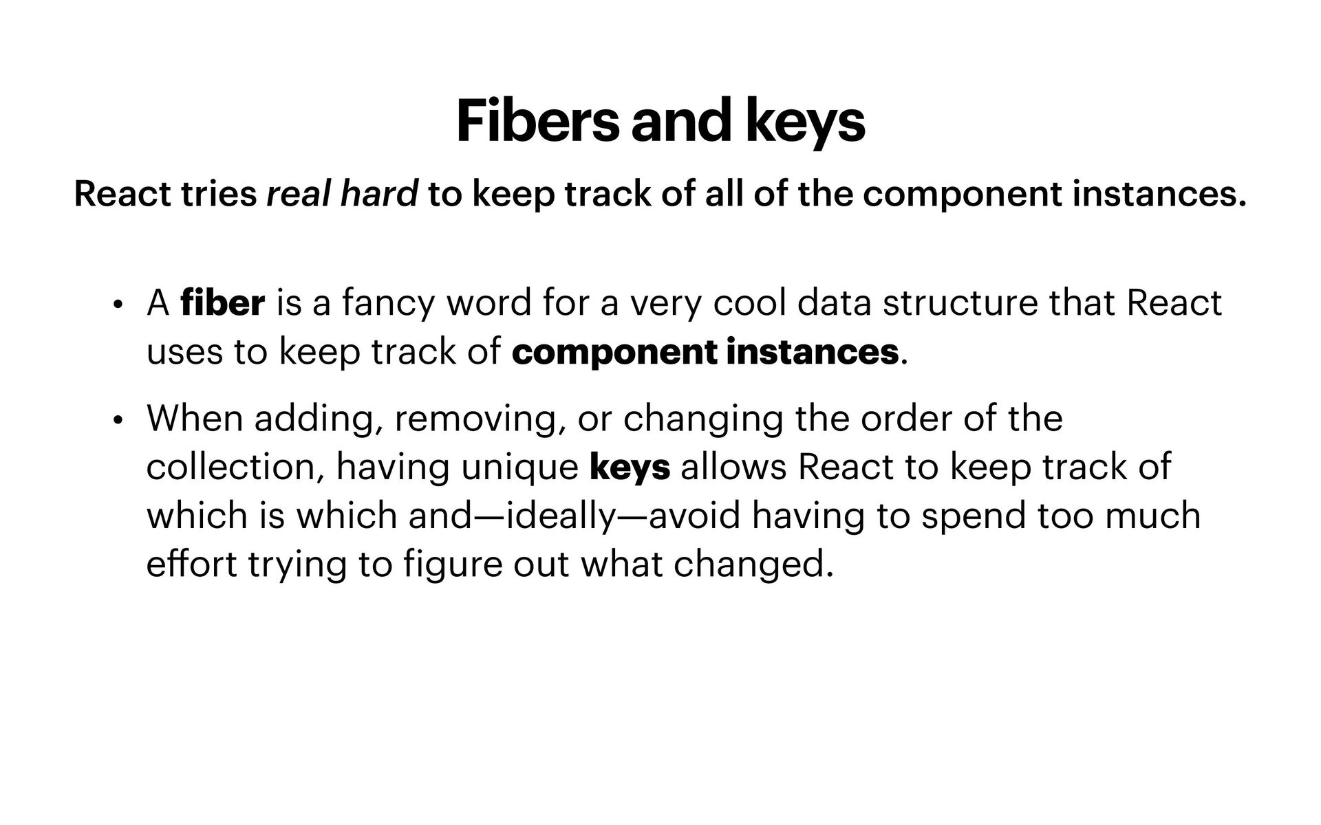 of all of the component instances. • A f iber is a fancy word for a very cool data structure that React uses to keep track of component instances. • When adding, removing, or changing the order of the collection, having unique keys allows React to keep track of which is which and—ideally—avoid having to spend too much e ff ort trying to f igure out what changed.