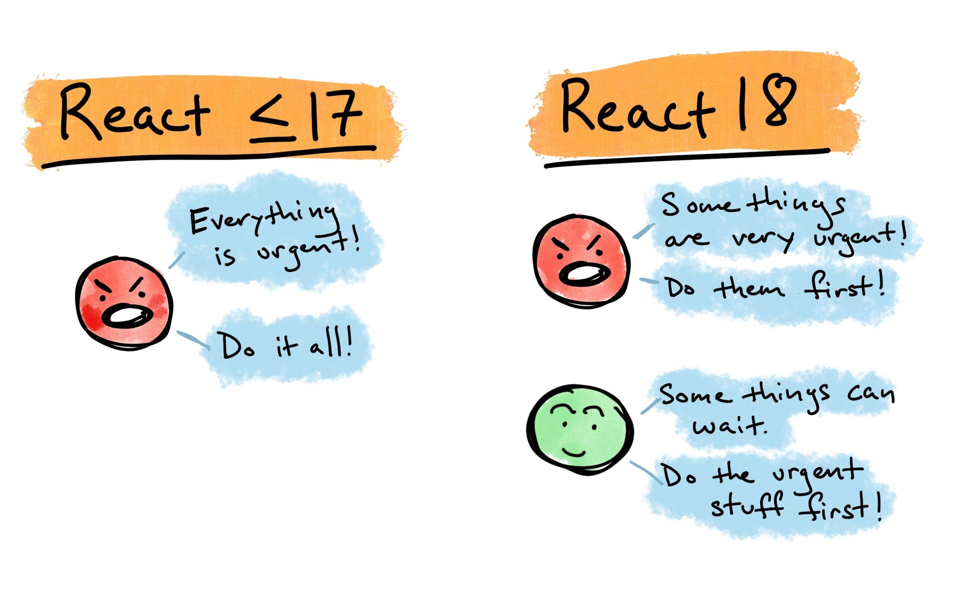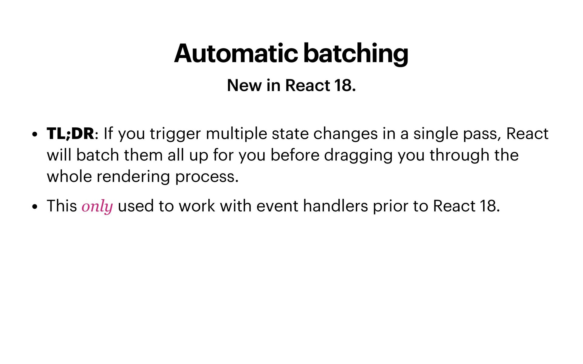 trigger multiple state changes in a single pass, React will batch them all up for you before dragging you through the whole rendering process. • This only used to work with event handlers prior to React 18.