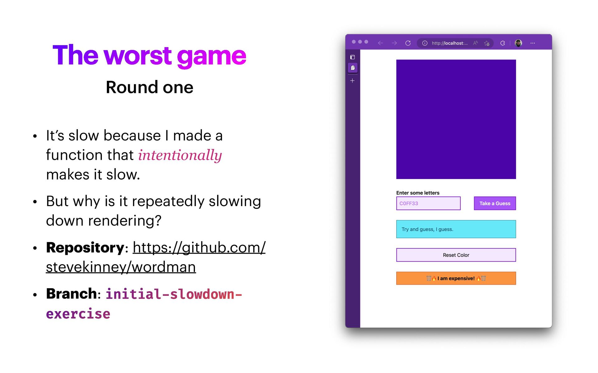 function that intentionally makes it slow. • But why is it repeatedly slowing down rendering? • Repository: https://github.com/ stevekinney/wordman • Branch: initial - slowdown - exercise Round one