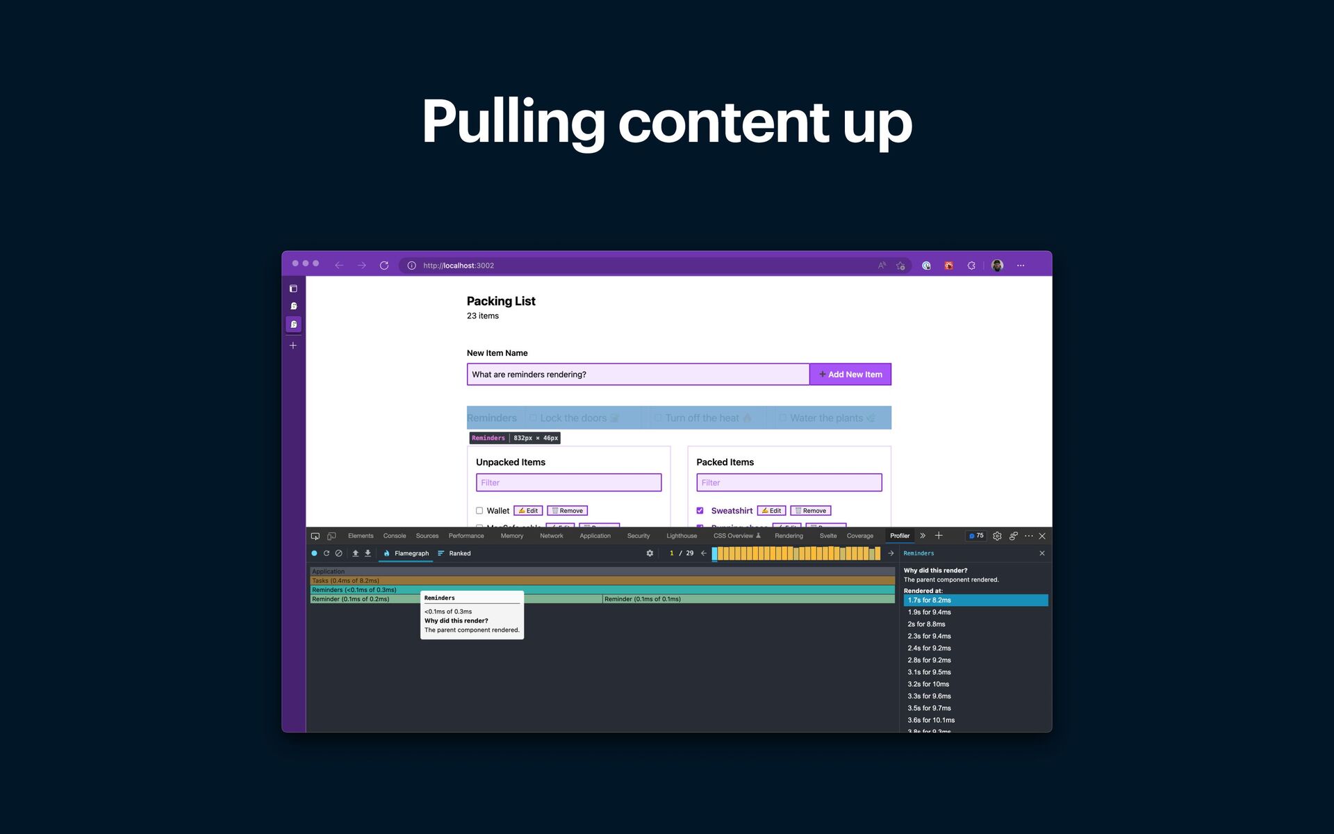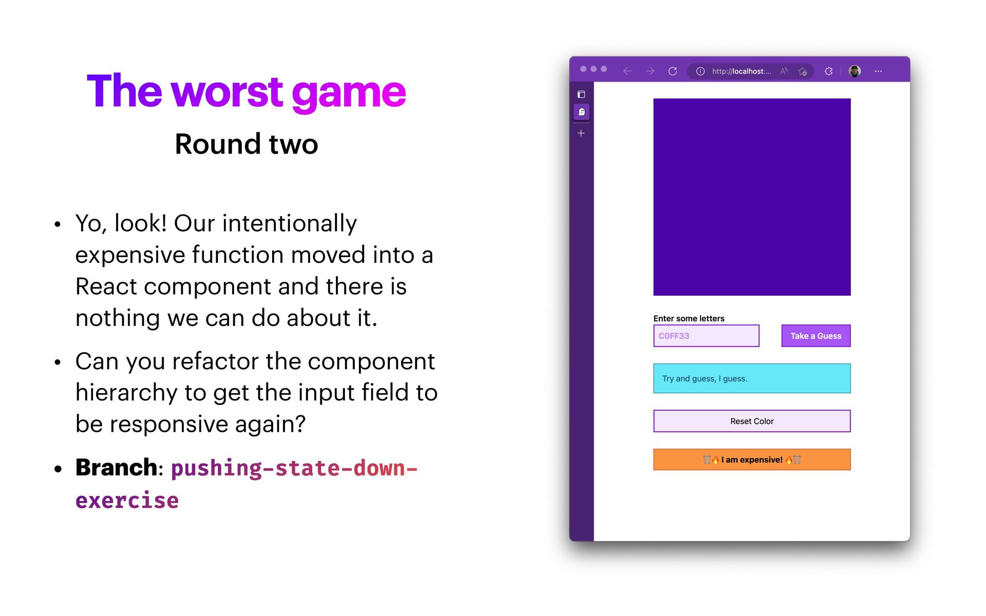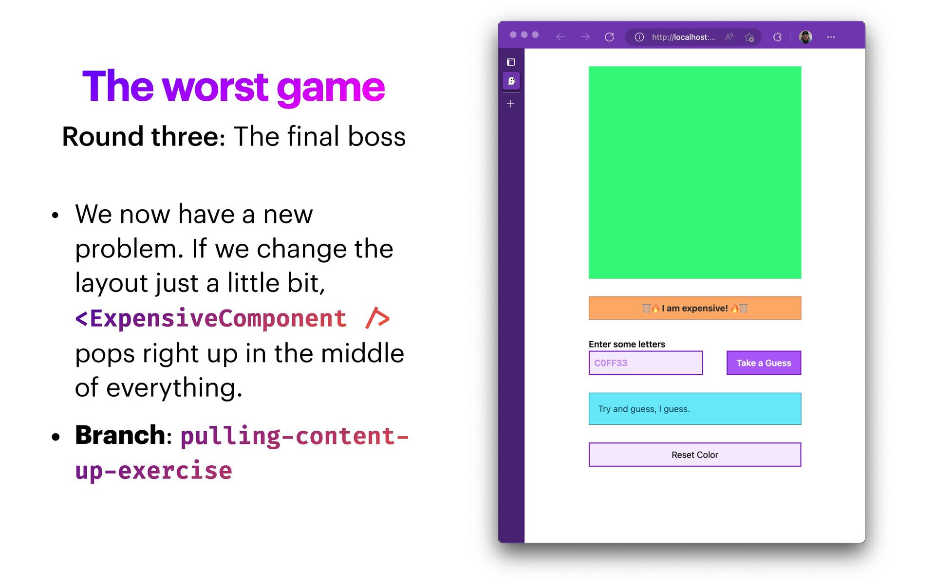 If we change the layout just a little bit, <ExpensiveComponent / > pops right up in the middle of everything. • Branch: pulling - content - up - exercise Round three: The f inal boss