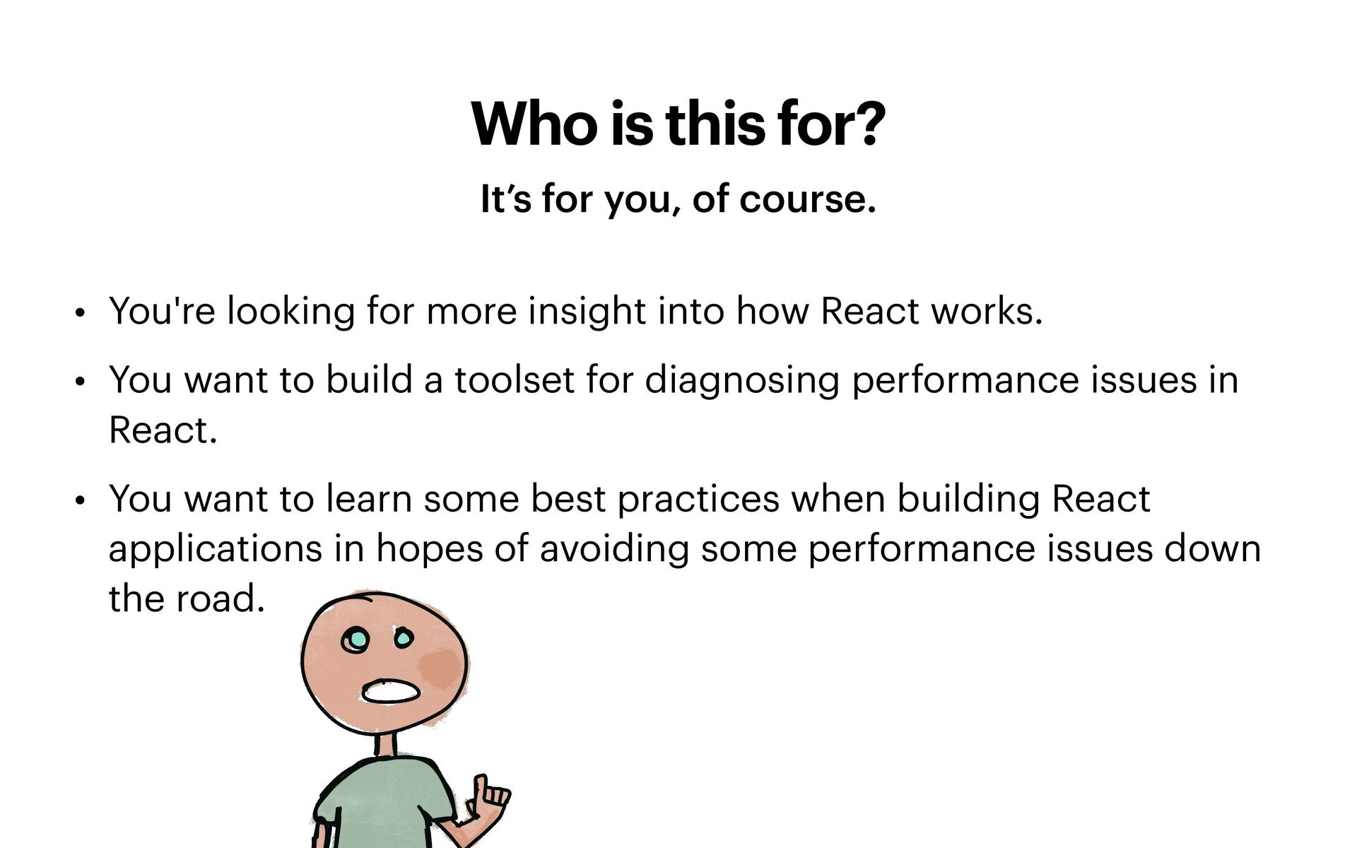 You're looking for more insight into how React works. • You want to build a toolset for diagnosing performance issues in React. • You want to learn some best practices when building React applications in hopes of avoiding some performance issues down the road.