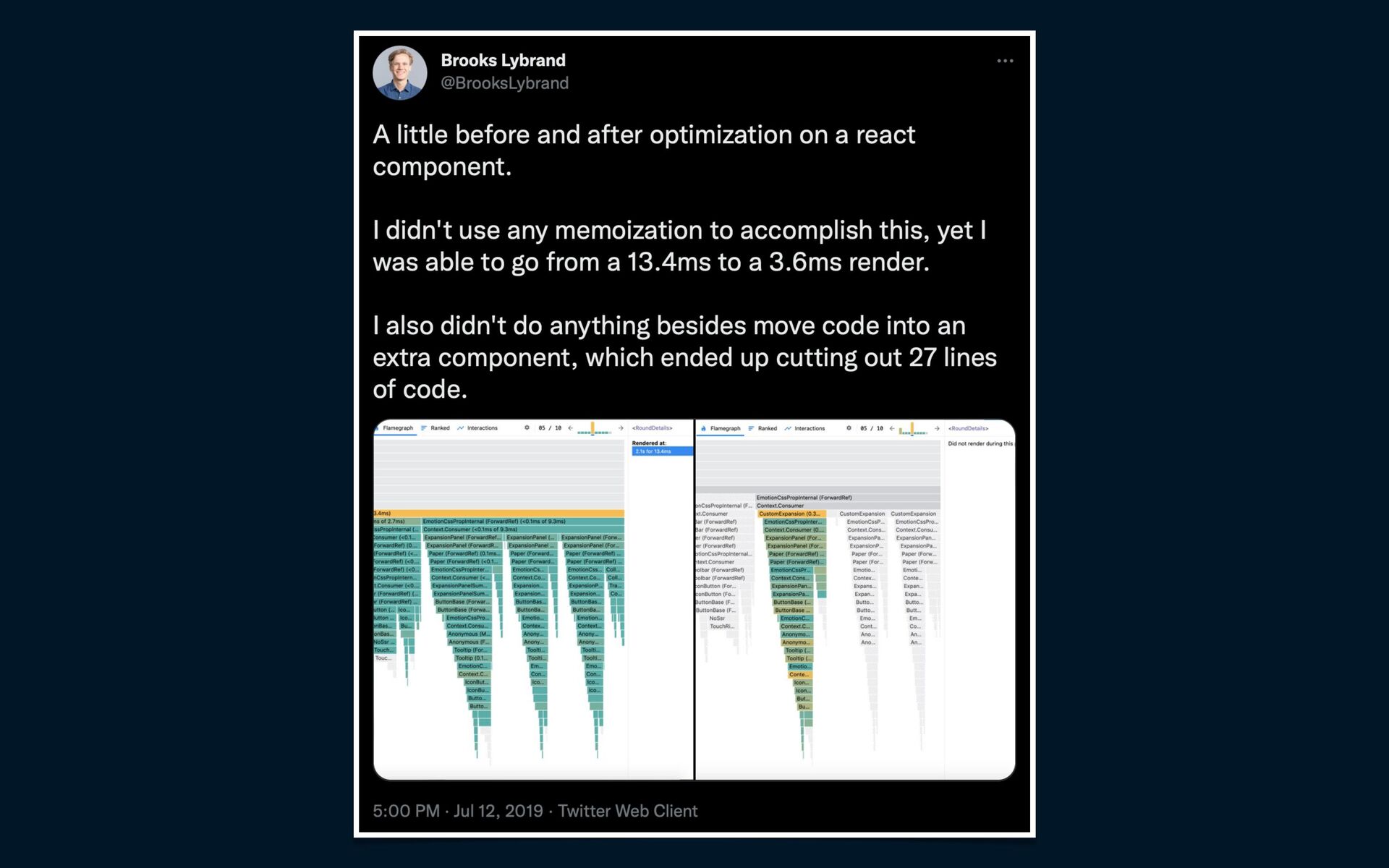 how you shape your component hierarchy or state—do that first. • Memoization is a solid strategy only if the cost of checking pays for itself with the time you save rendering. • Using the Suspense API to progressively load your application is a good idea™. And, more good stu ff will come soon. • The Transition API is there for you when you’re really in a pickle.