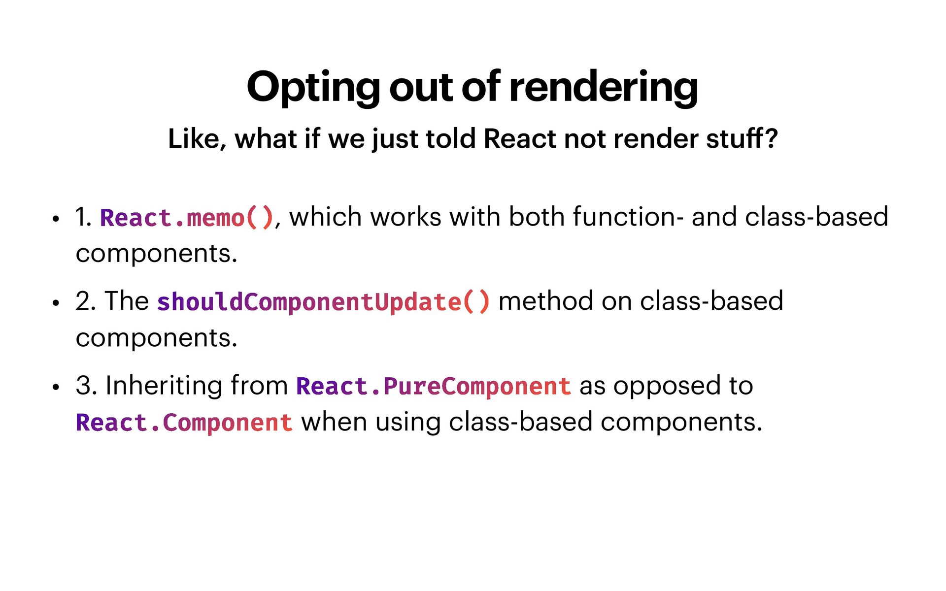 React not render stu ff ? • 1. React.memo(), which works with both function- and class-based components. • 2. The shouldComponentUpdate() method on class-based components. • 3. Inheriting from React.PureComponent as opposed to React.Component when using class-based components.