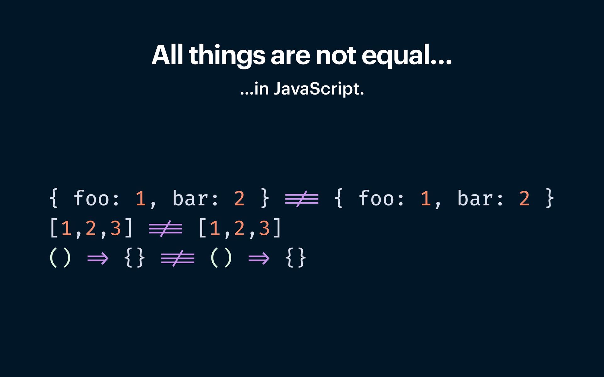 bar: 2 } ! = = { foo: 1, bar: 2 } [1,2,3] ! = = [1,2,3] () = > {} ! = = () = > {}