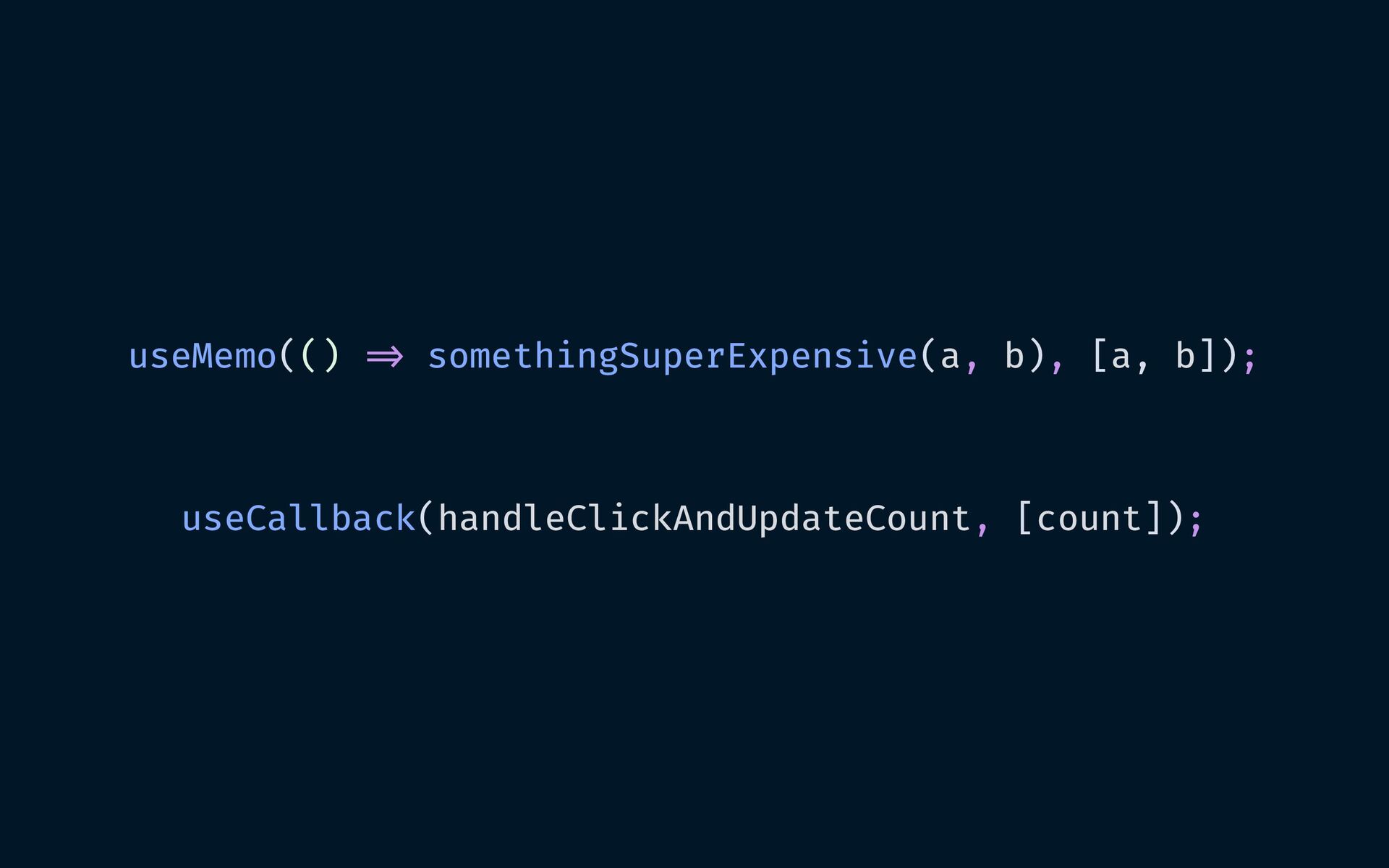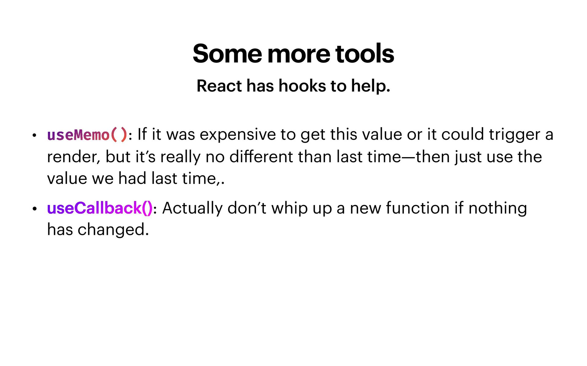 If it was expensive to get this value or it could trigger a render, but it’s really no di ff erent than last time—then just use the value we had last time,. • useCallback(): Actually don’t whip up a new function if nothing has changed.