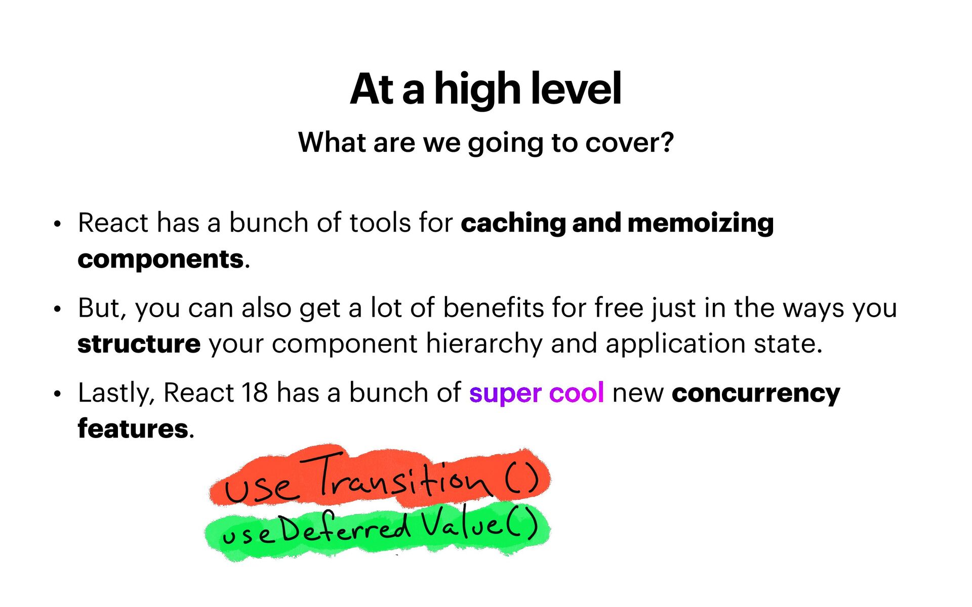 • React has a bunch of tools for caching and memoizing components. • But, you can also get a lot of bene f its for free just in the ways you structure your component hierarchy and application state. • Lastly, React 18 has a bunch of super cool new concurrency features.