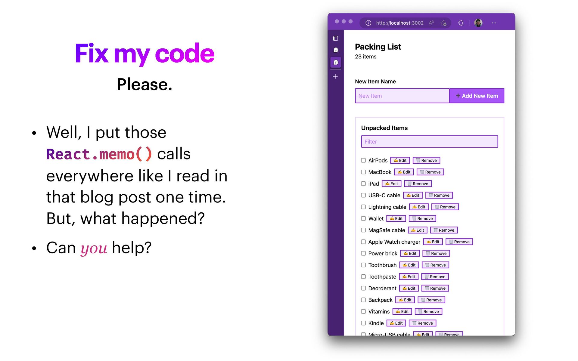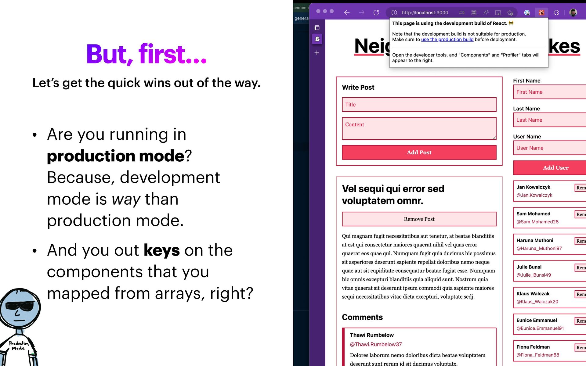 Because, development mode is way than production mode. • And you out keys on the components that you mapped from arrays, right? Let’s get the quick wins out of the way.