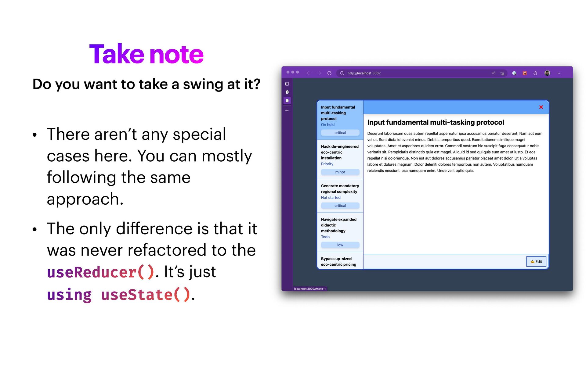 can mostly following the same approach. • The only di ff erence is that it was never refactored to the useReducer(). It’s just using useState(). Do you want to take a swing at it?