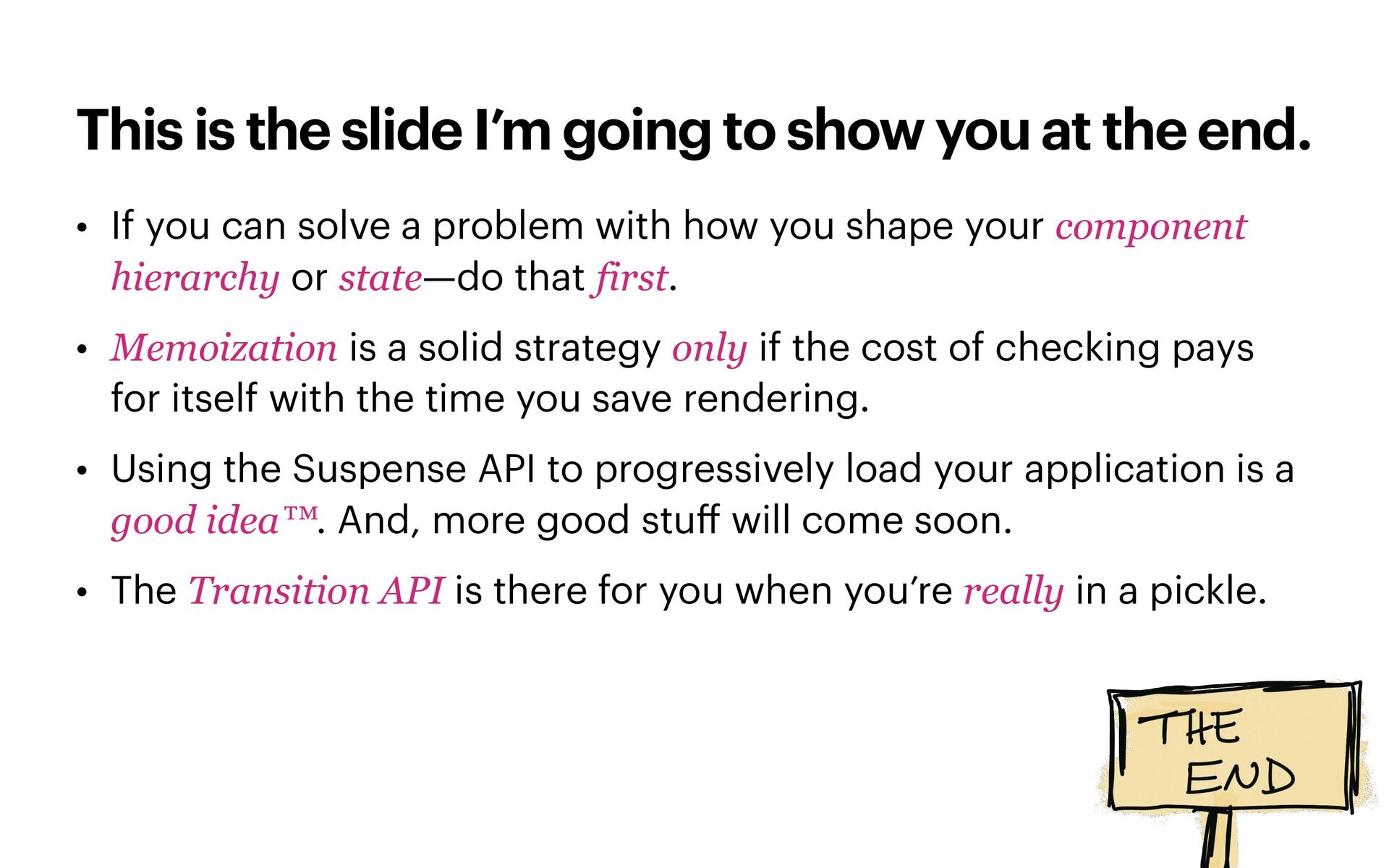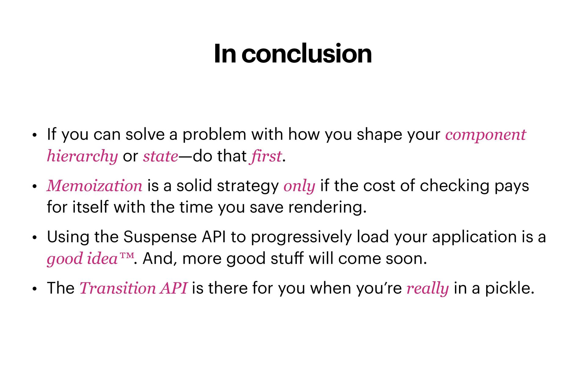 the end. • If you can solve a problem with how you shape your component hierarchy or state—do that first. • Memoization is a solid strategy only if the cost of checking pays for itself with the time you save rendering. • Using the Suspense API to progressively load your application is a good idea™. And, more good stu ff will come soon. • The Transition API is there for you when you’re really in a pickle.