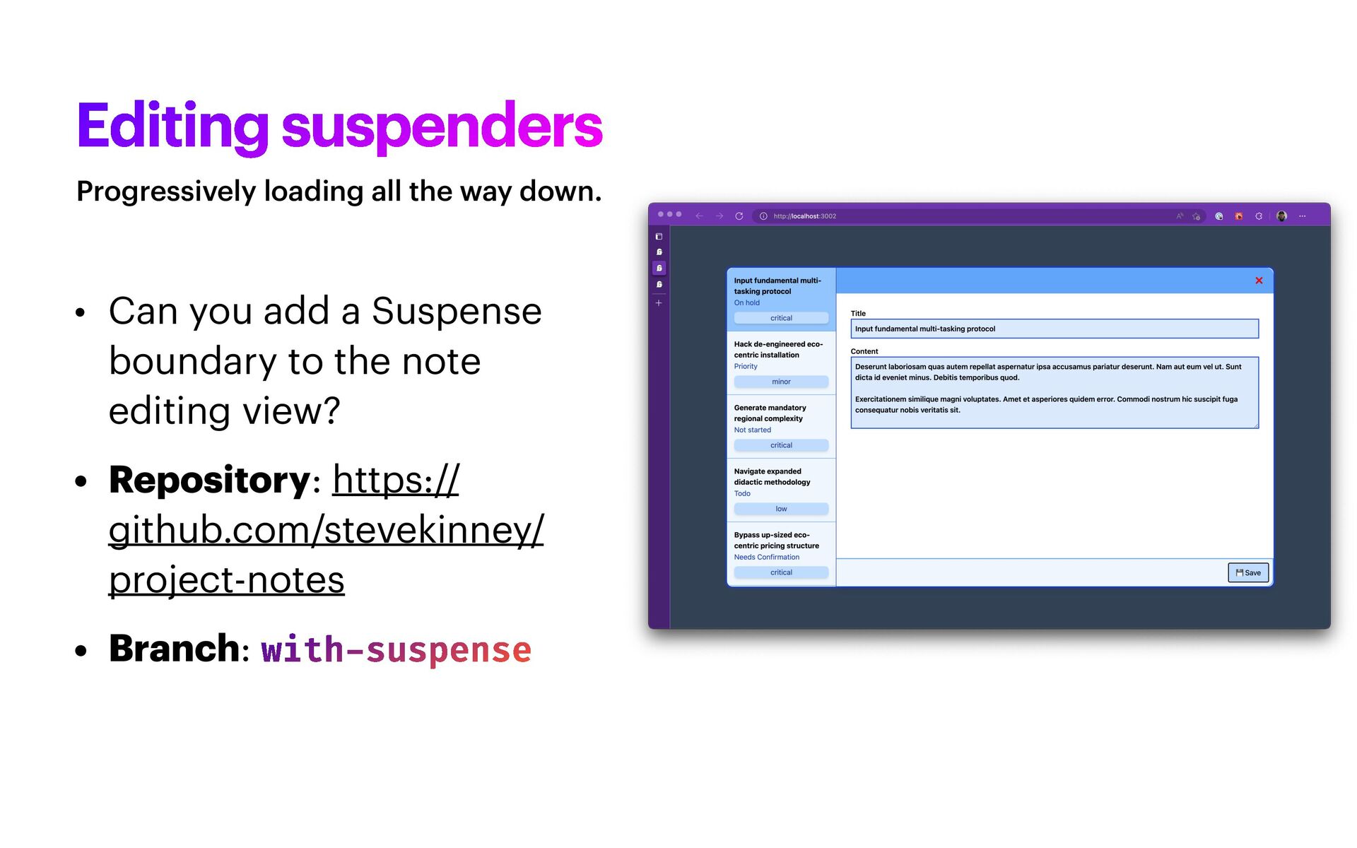 the note editing view? • Repository: https:// github.com/stevekinney/ project-notes • Branch: with - suspense Progressively loading all the way down.