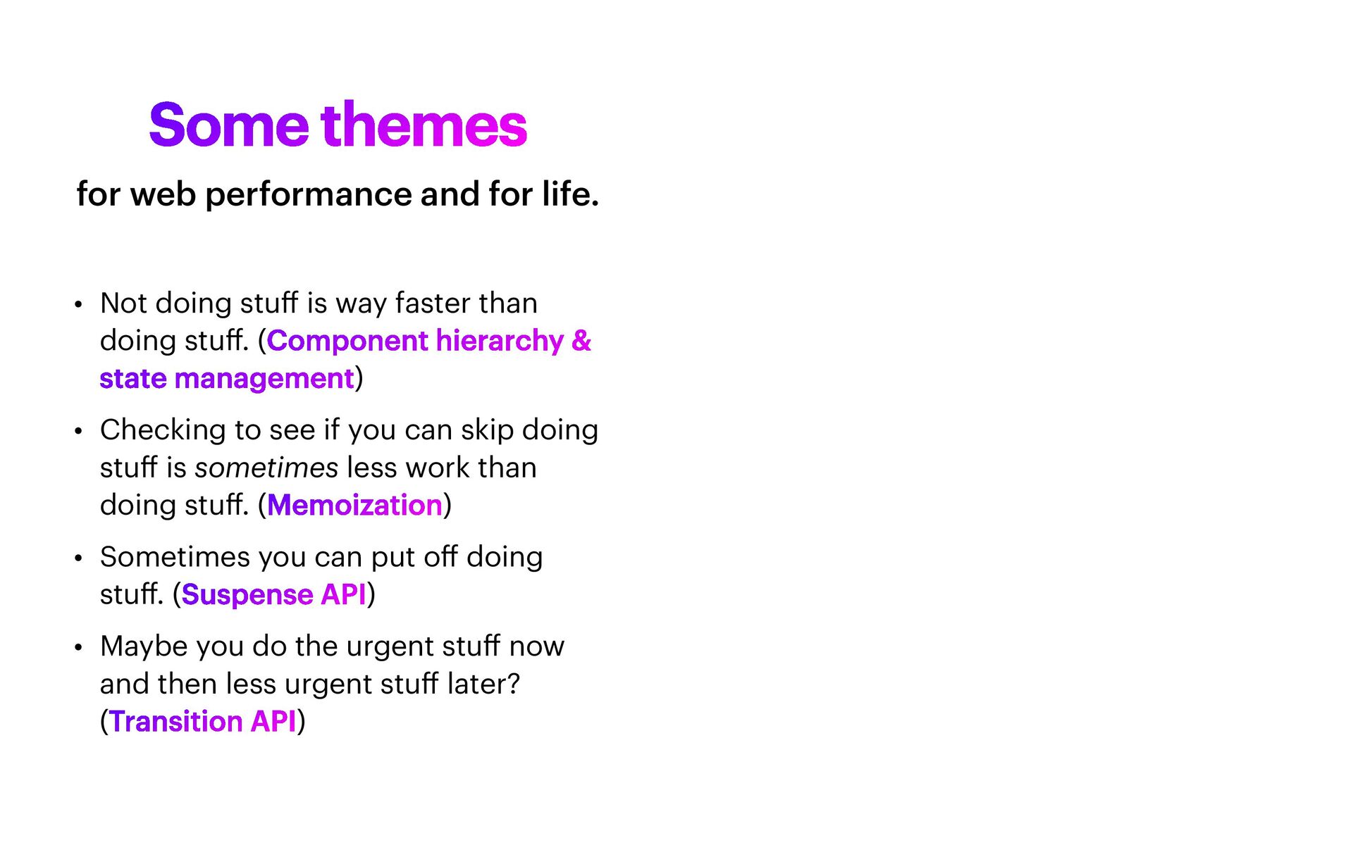 than doing stu ff . (Component hierarchy & state management) • Checking to see if you can skip doing stu ff is sometimes less work than doing stu ff . (Memoization) • Sometimes you can put o ff doing stu ff . (Suspense API) • Maybe you do the urgent stu ff now and then less urgent stu ff later? (Transition API) for web performance and for life.
