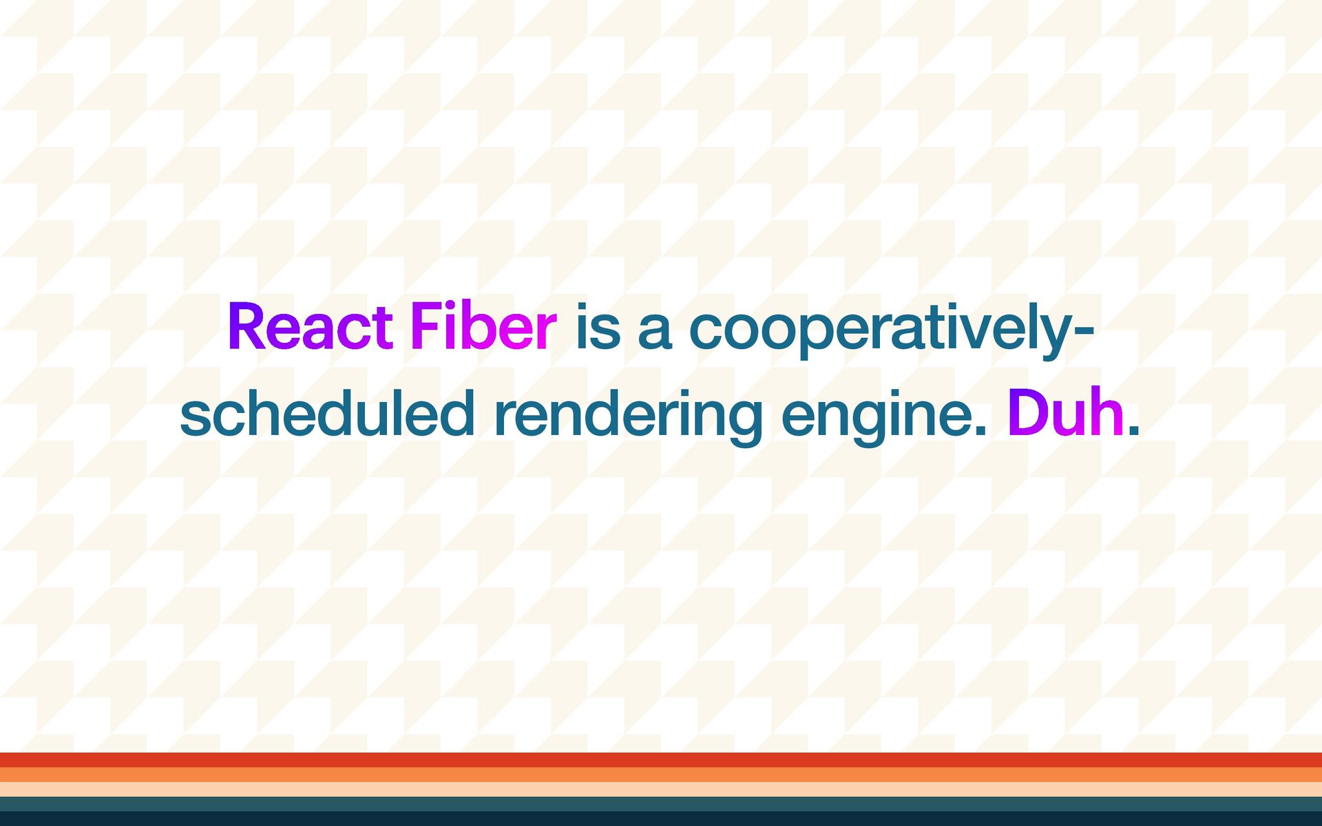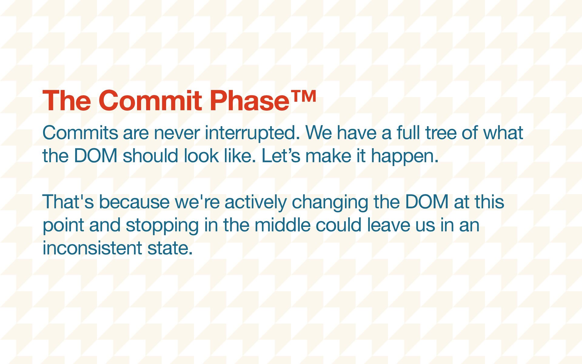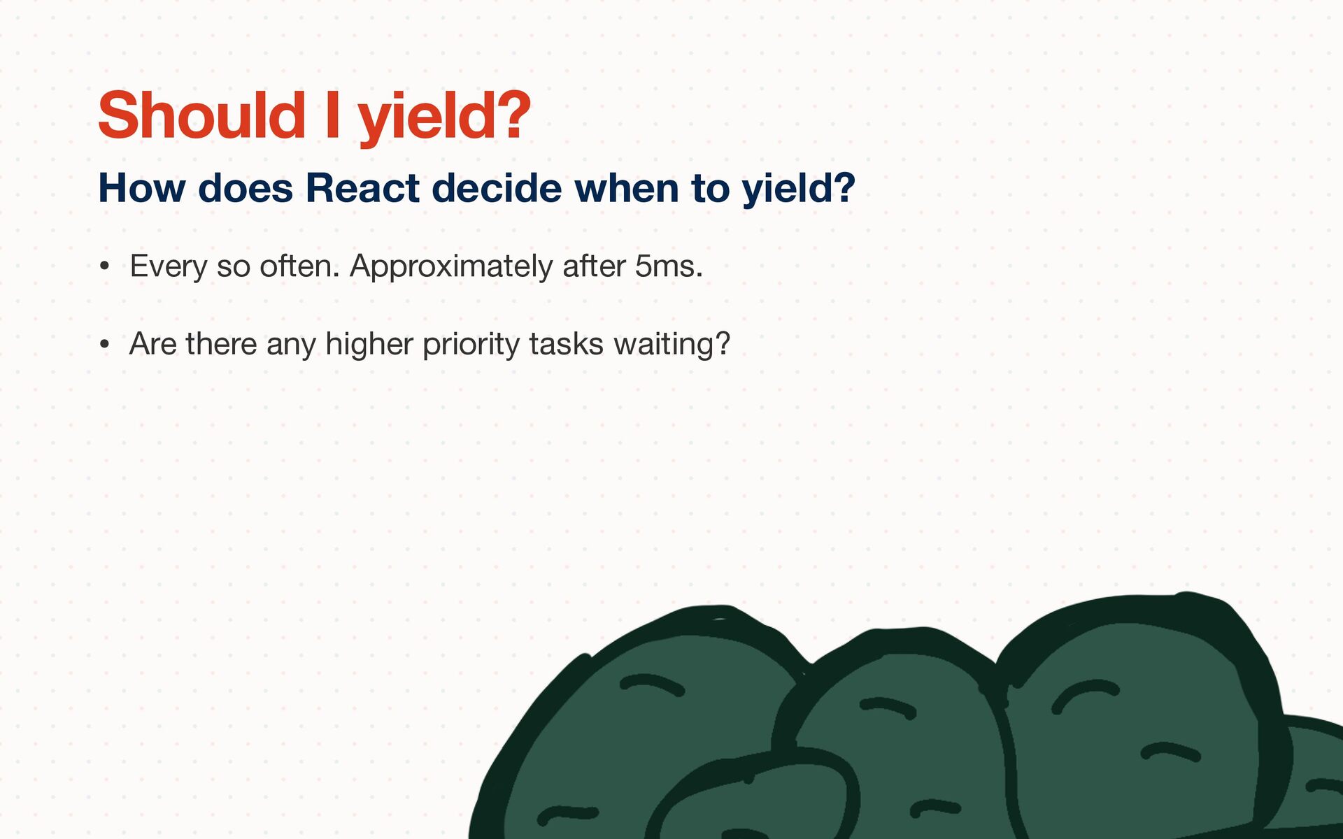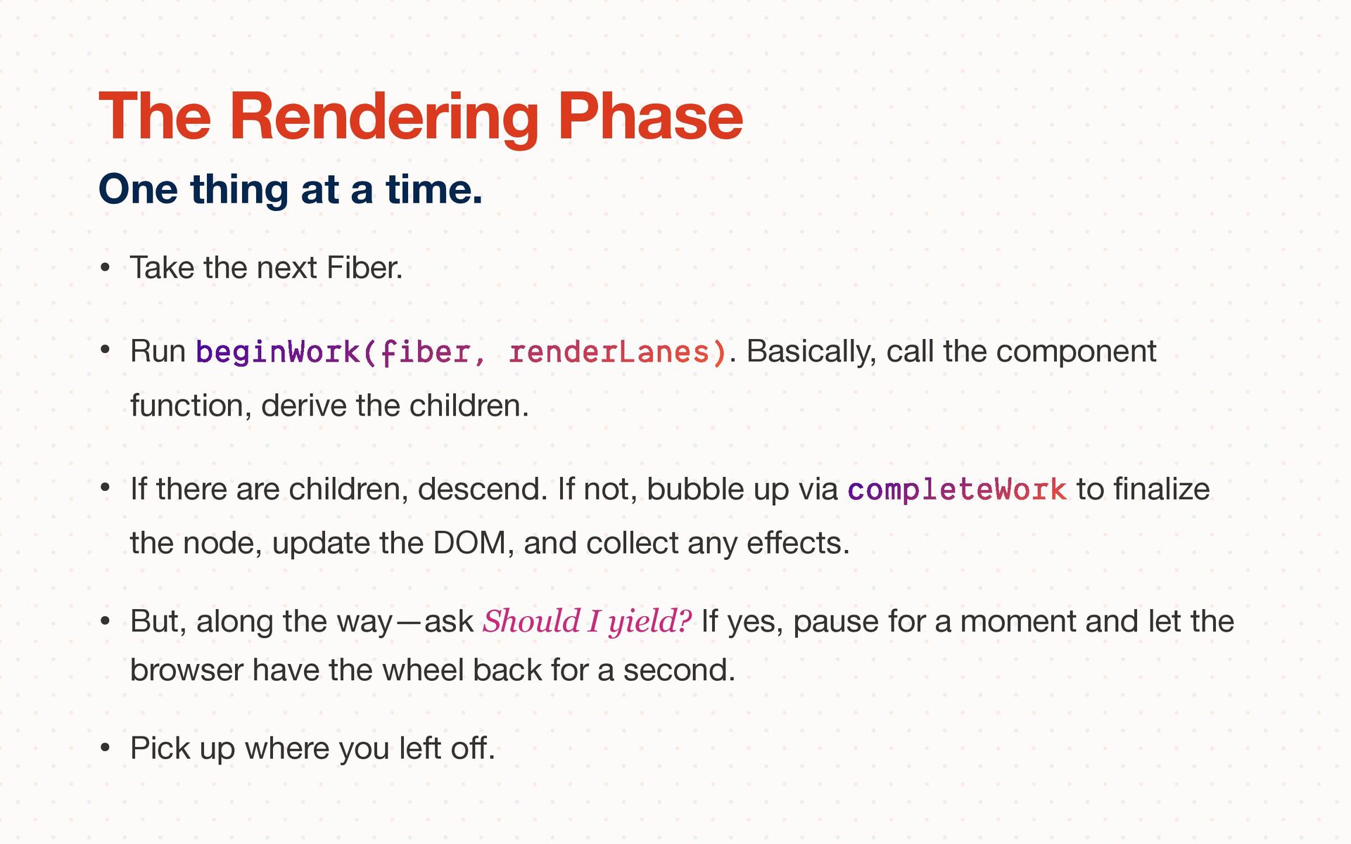 call the component function, derive the children. • If there are children, descend. If not, bubble up via completeWork to fi nalize the node, update the DOM, and collect any e ff ects. • But, along the way—ask Should I yield? If yes, pause for a moment and let the browser have the wheel back for a second. • Pick up where you left o ff . One thing at a time. The Rendering Phase