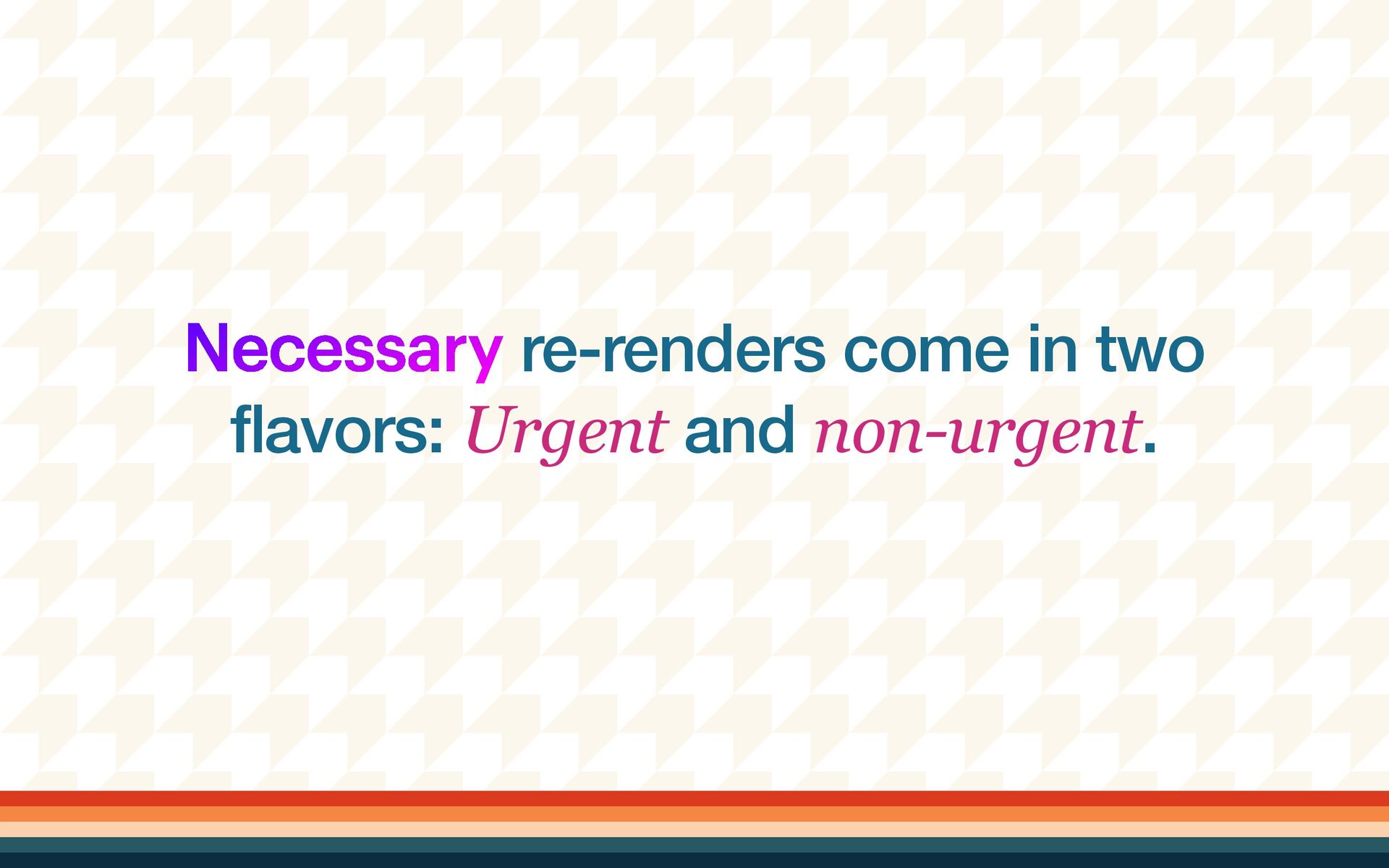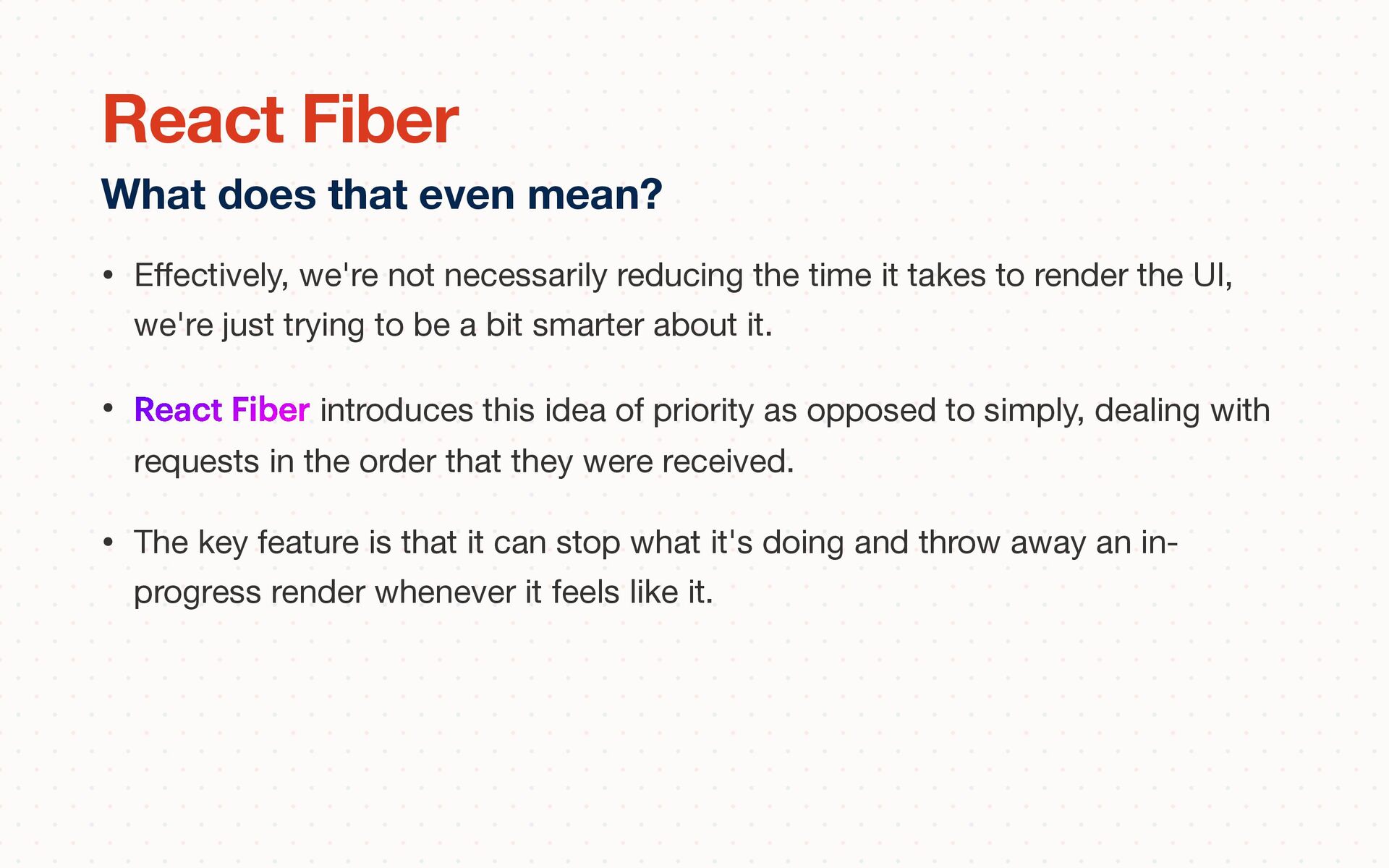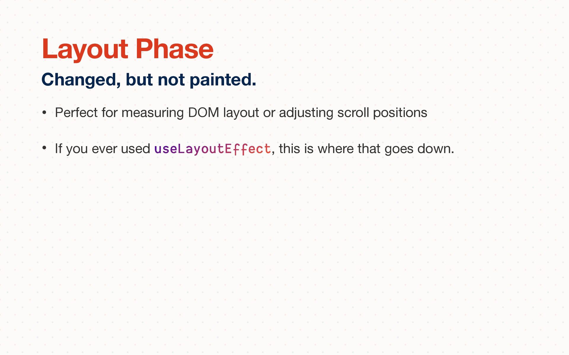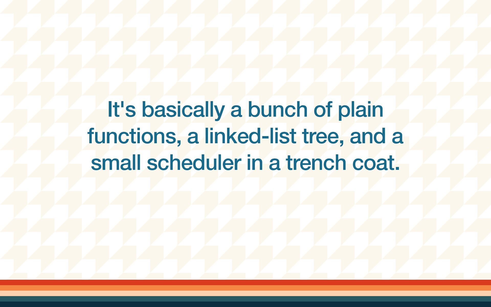 call the component function, derive the children. • If there are children, descend. If not, bubble up via completeWork to fi nalize the node, update the DOM, and collect any e ff ects. • But, along the way—ask Should I yield? If yes, pause for a moment and let the browser have the wheel back for a second. • Pick up where you left o ff . One thing at a time. The Rendering Phase