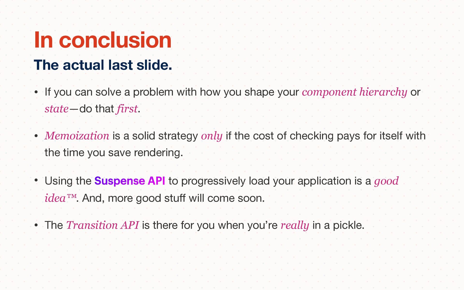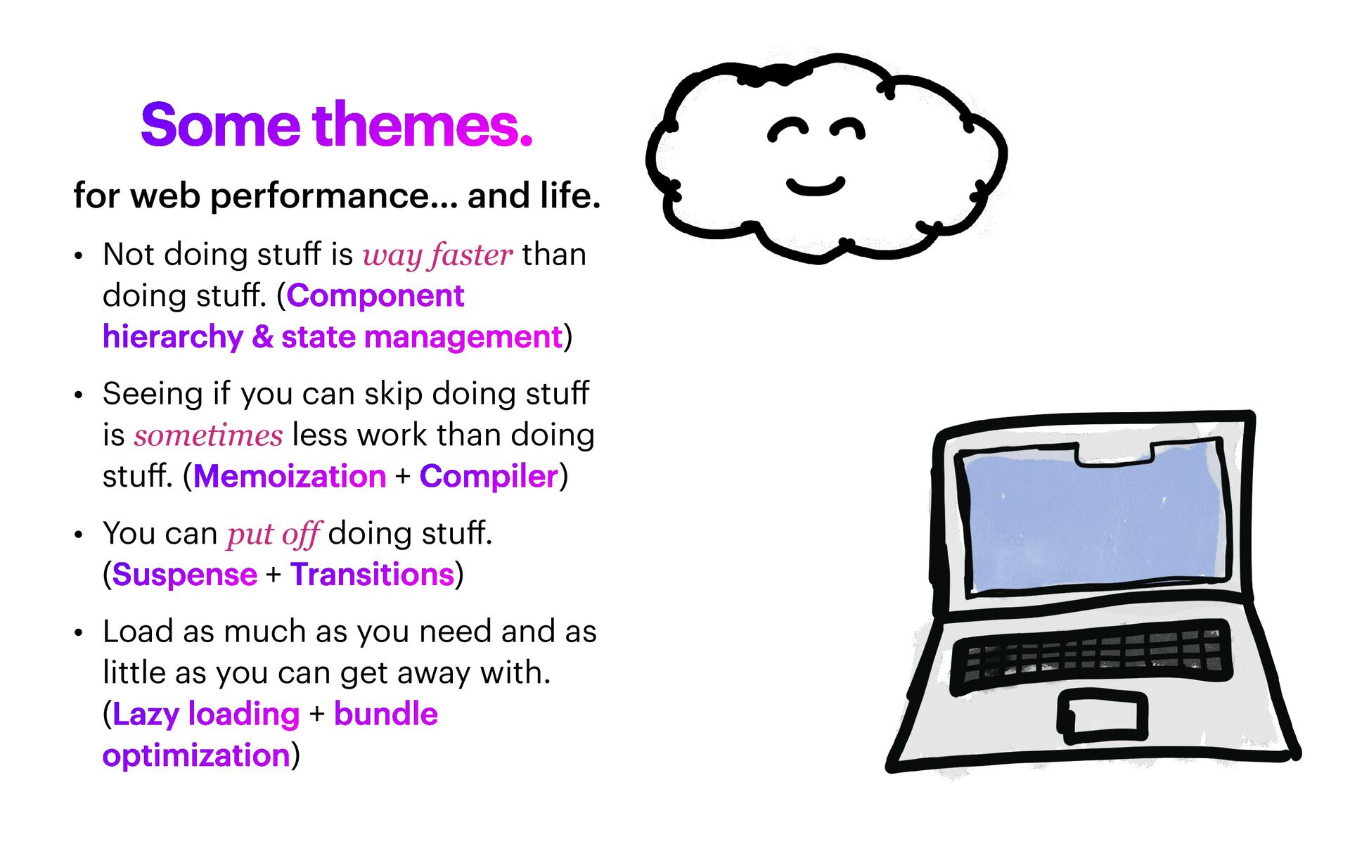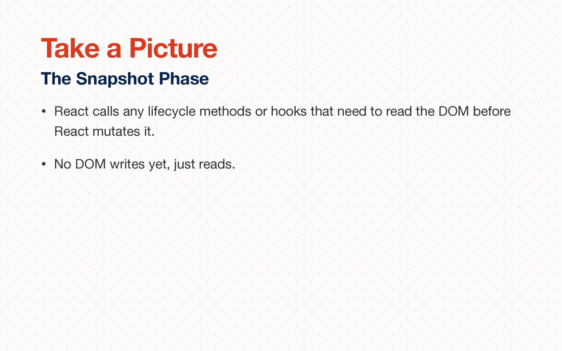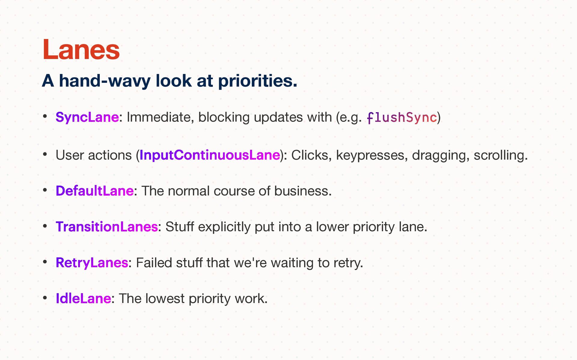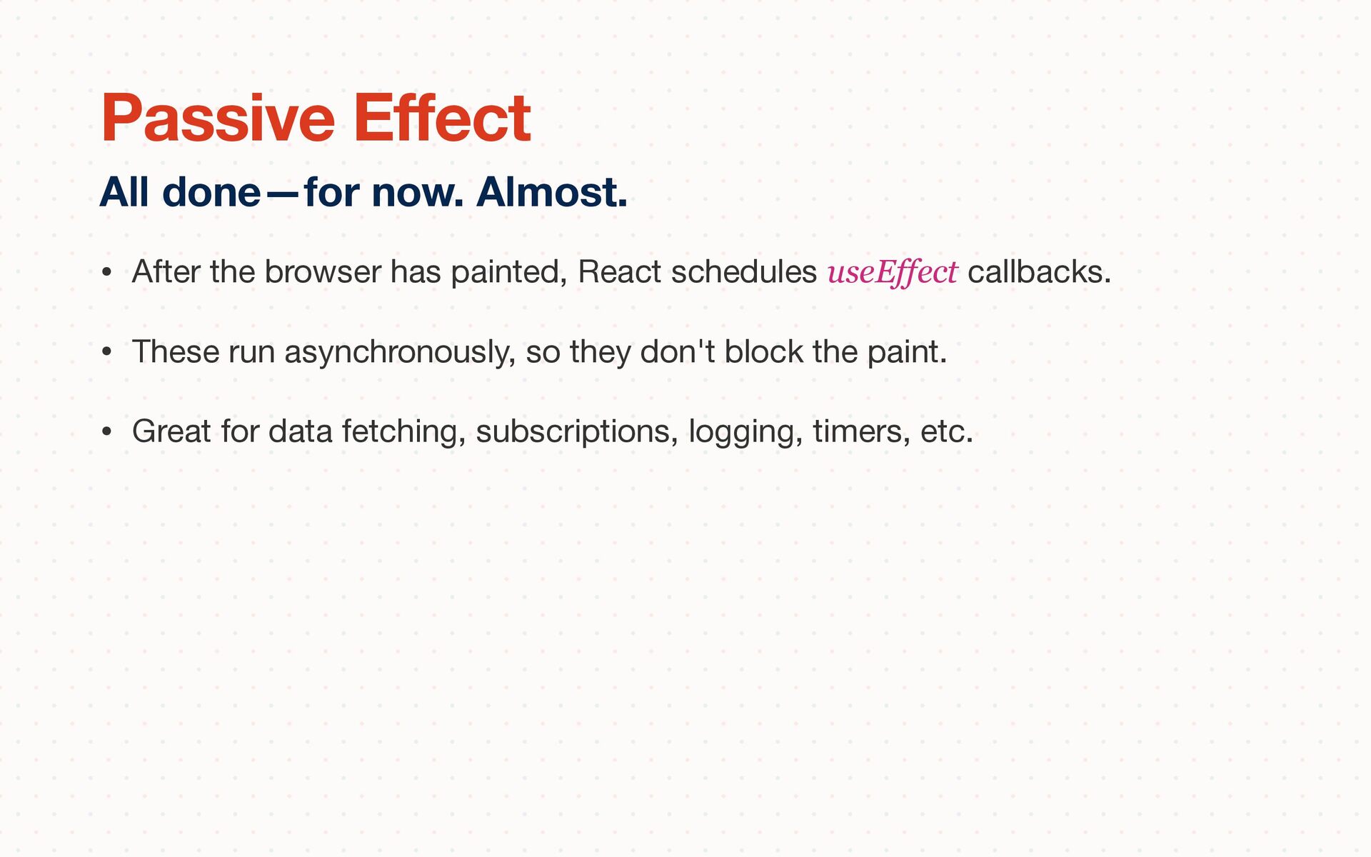 call the component function, derive the children. • If there are children, descend. If not, bubble up via completeWork to fi nalize the node, update the DOM, and collect any e ff ects. • But, along the way—ask Should I yield? If yes, pause for a moment and let the browser have the wheel back for a second. • Pick up where you left o ff . One thing at a time. The Rendering Phase