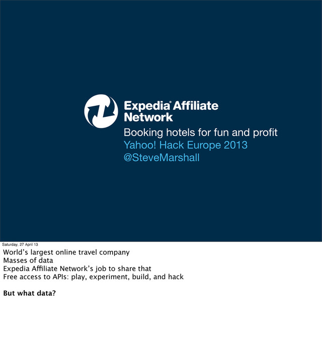 @SteveMarshall Saturday, 27 April 13 World’s largest online travel company Masses of data Expedia Affiliate Network’s job to share that Free access to APIs: play, experiment, build, and hack But what data?