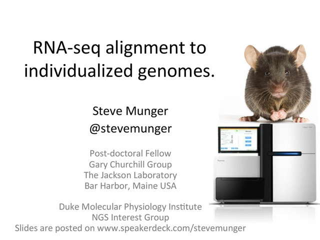 @stevemunger Post-‐doctoral Fellow Gary Churchill Group The Jackson Laboratory Bar Harbor, Maine USA Duke Molecular Physiology InsNtute NGS Interest Group Slides are posted on www.speakerdeck.com/stevemunger