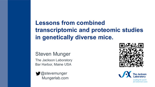 design “The variable effects of variables” - What are we missing when we only profile the transcriptome? o Age, Diet, Sex How genetic variation affects the proteome o Liver, Kidney, Heart Getting into the “weeds” – Identifying regulators in subthreshold QTL peaks. Gary Churchill Ron Korstanje @stevemunger