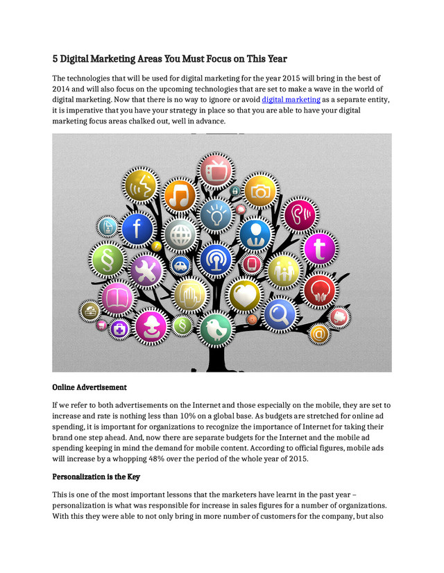 The technologies that will be used for digital marketing for the year 2015 will bring in the best of 2014 and will also focus on the upcoming technologies that are set to make a wave in the world of digital marketing. Now that there is no way to ignore or avoid digital marketing as a separate entity, it is imperative that you have your strategy in place so that you are able to have your digital marketing focus areas chalked out, well in advance. Online Advertisement If we refer to both advertisements on the Internet and those especially on the mobile, they are set to increase and rate is nothing less than 10% on a global base. As budgets are stretched for online ad spending, it is important for organizations to recognize the importance of Internet for taking their brand one step ahead. And, now there are separate budgets for the Internet and the mobile ad spending keeping in mind the demand for mobile content. According to official figures, mobile ads will increase by a whopping 48% over the period of the whole year of 2015. Personalization is the Key This is one of the most important lessons that the marketers have learnt in the past year – personalization is what was responsible for increase in sales figures for a number of organizations. With this they were able to not only bring in more number of customers for the company, but also