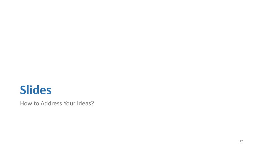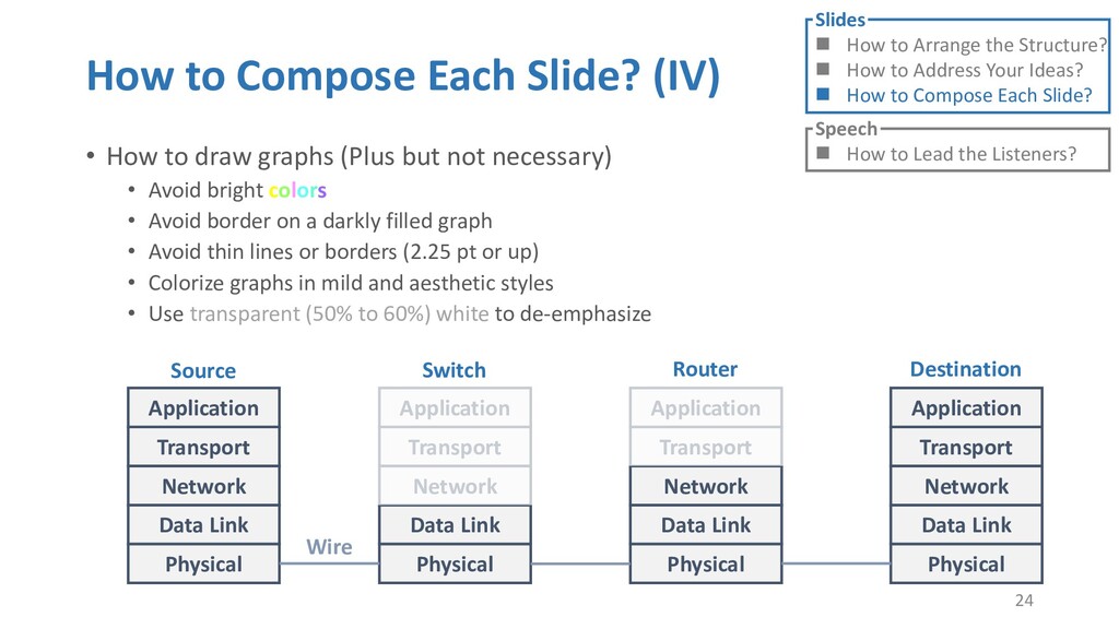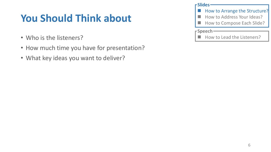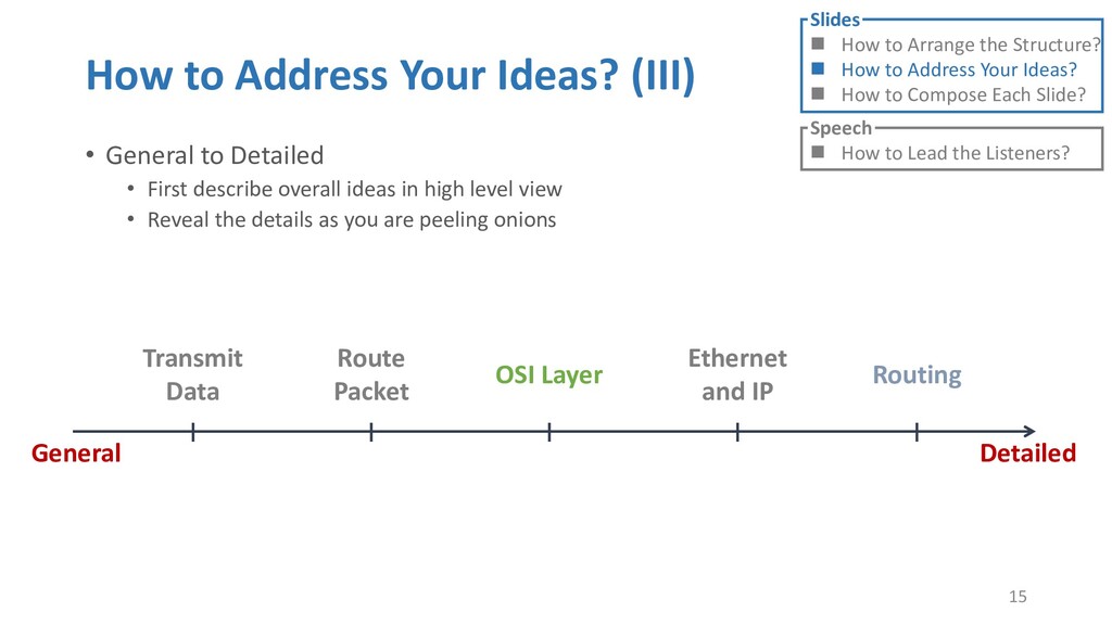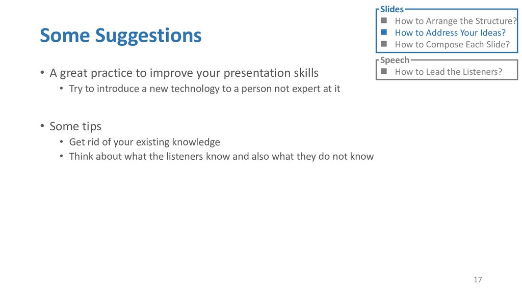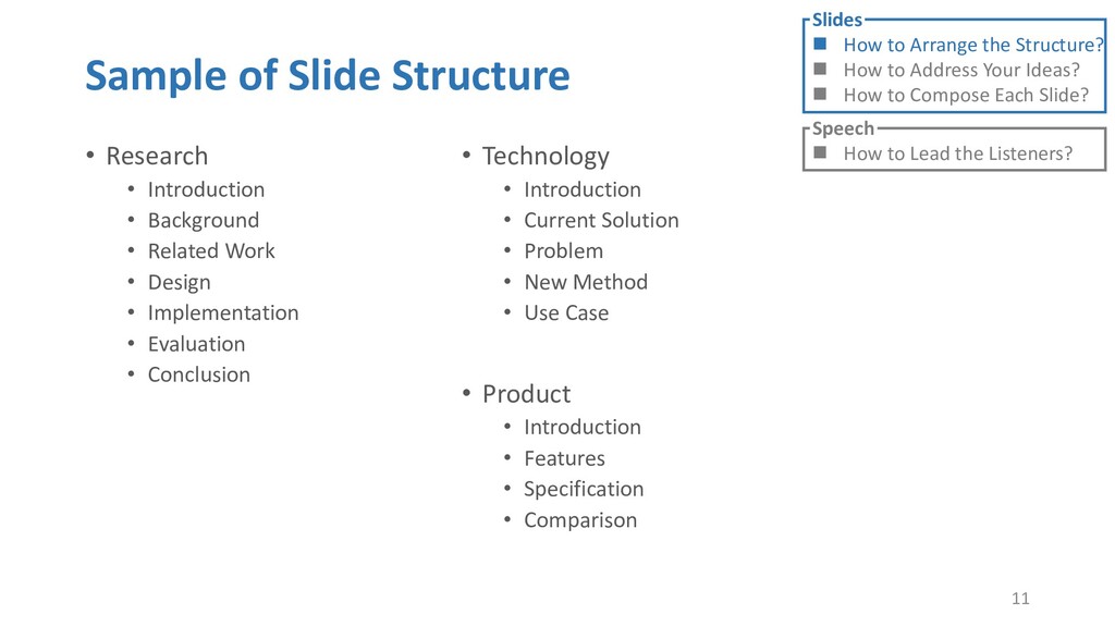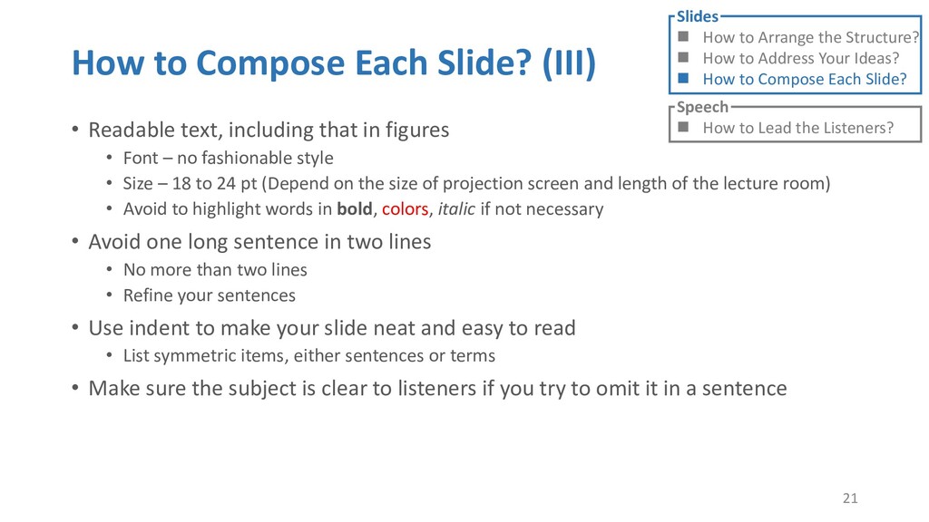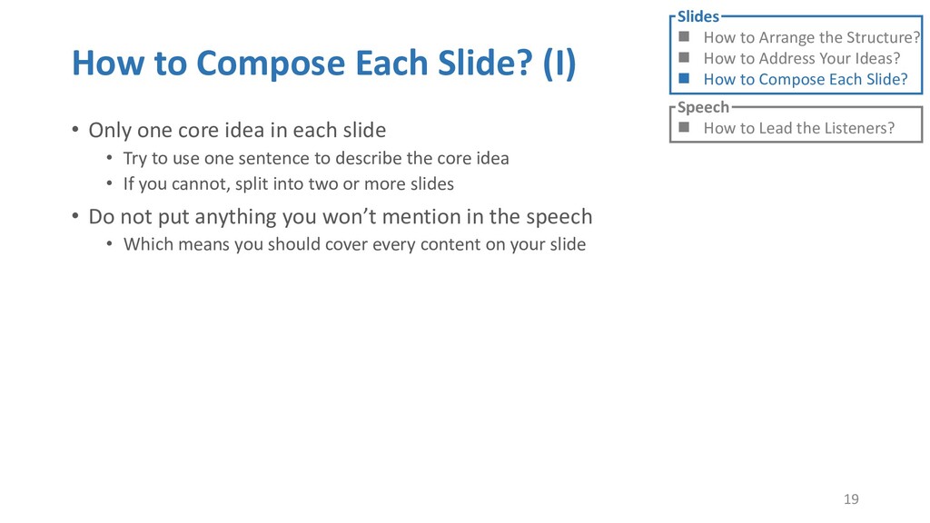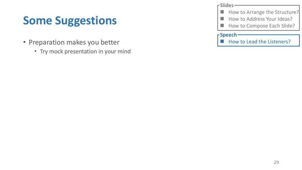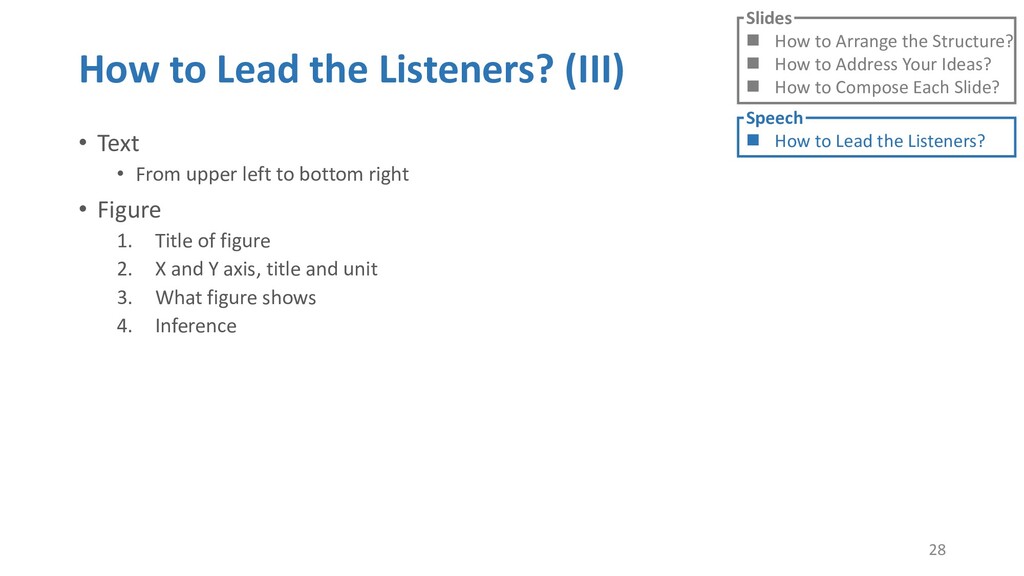 or jump into contents in later slides • Just focus on the core idea in the current slide • Otherwise, the listener would be misleading and confused • If someone asks, reply with “That’s a good question. But please keep in mind and we’ll dive into it later.” • Use transition between slides • Keep the listeners following your steps • E.g. “After talking about …, then I would like to introduce …” • Quick recap and summary to strengthen listeners’ understanding • E.g. “So far we have great understanding of …” 27 Slides How to Arrange the Structure? How to Address Your Ideas? How to Compose Each Slide? Speech How to Lead the Listeners?