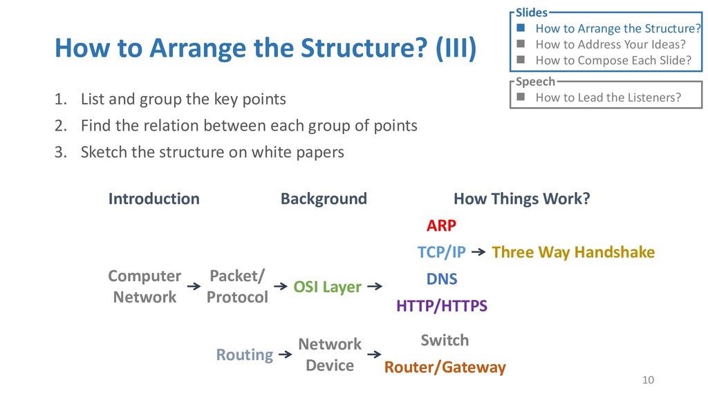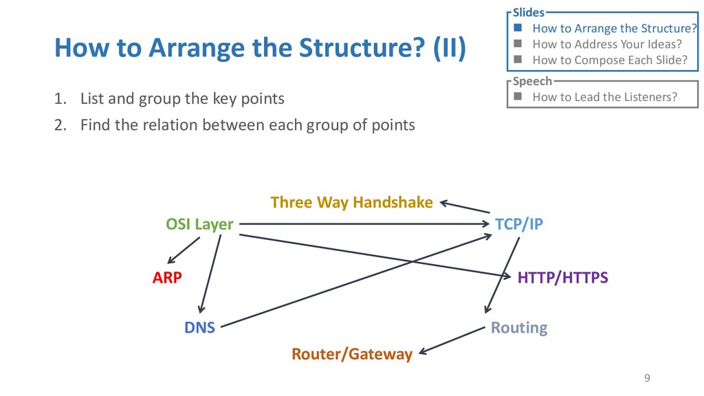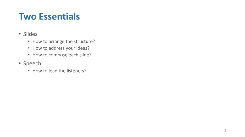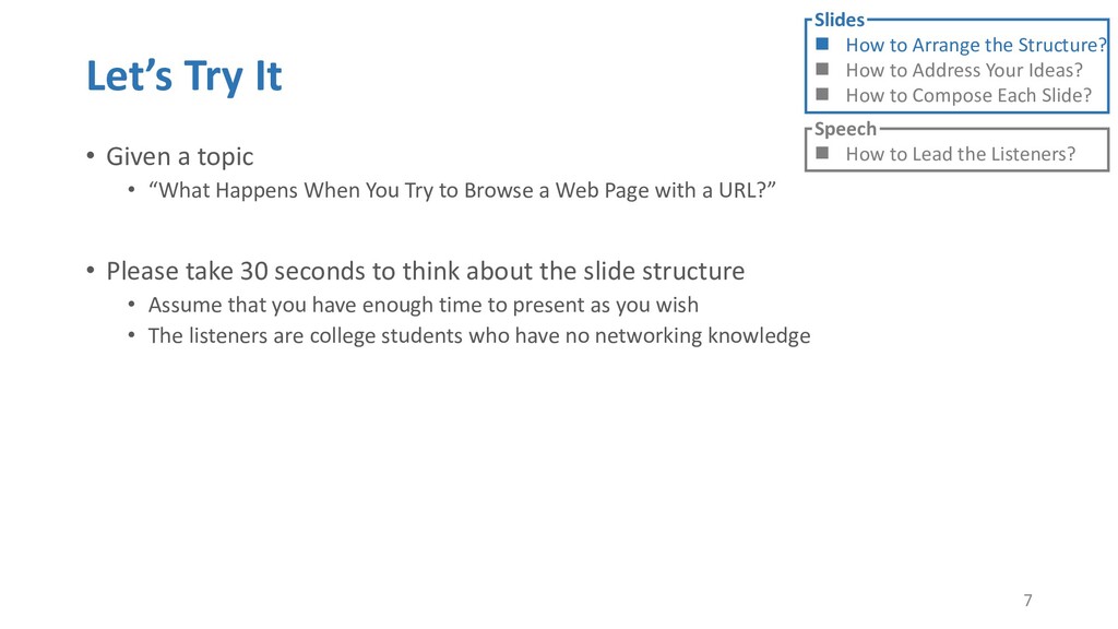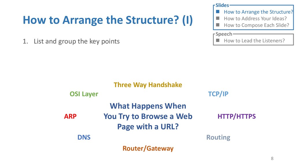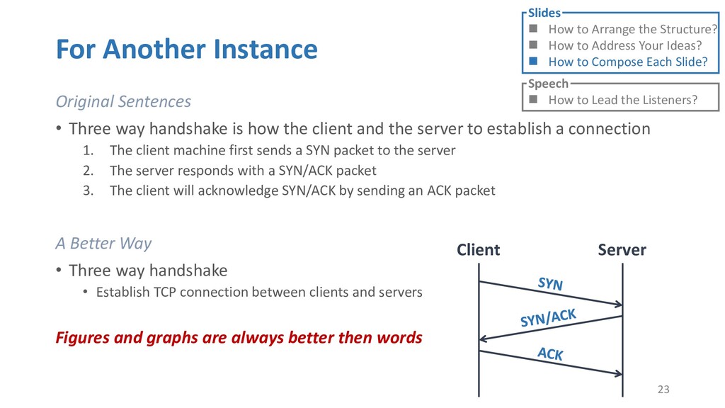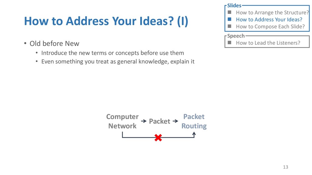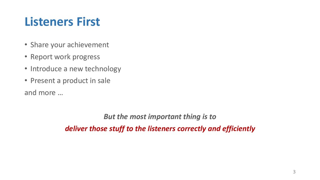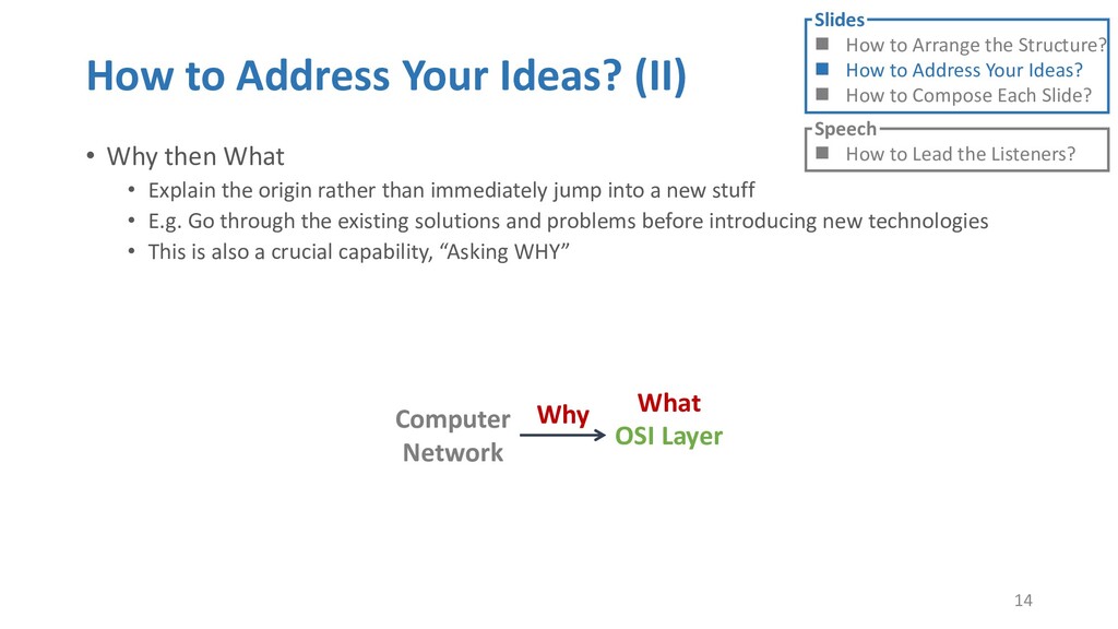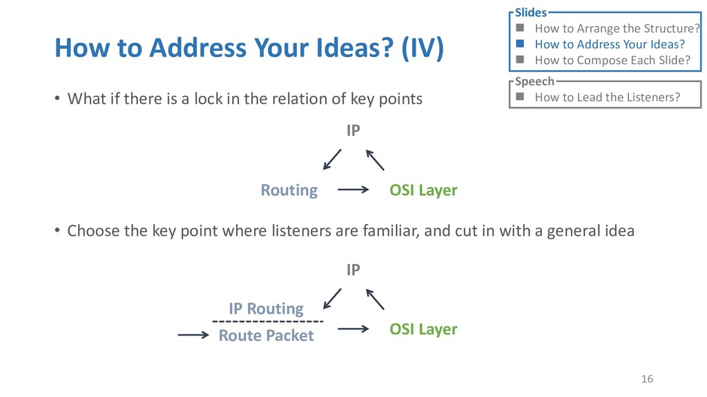or jump into contents in later slides • Just focus on the core idea in the current slide • Otherwise, the listener would be misleading and confused • If someone asks, reply with “That’s a good question. But please keep in mind and we’ll dive into it later.” • Use transition between slides • Keep the listeners following your steps • E.g. “After talking about …, then I would like to introduce …” • Quick recap and summary to strengthen listeners’ understanding • E.g. “So far we have great understanding of …” 27 Slides How to Arrange the Structure? How to Address Your Ideas? How to Compose Each Slide? Speech How to Lead the Listeners?