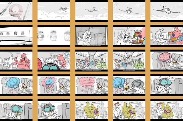 A pivotal sequence from a discarded early concept for the film. In a nefarious plot to acquire ownership of the hotel, here we see the script’s original villain, real estate developer Carter Quinston (a fast talking car salesman-type swindler modeled on Quentin Tarantino) attempting to woo the hotel's monster residents by flying them on his private jet and lavishing them with luxurious amenities en route to confronting Drac (Adam Sandler).