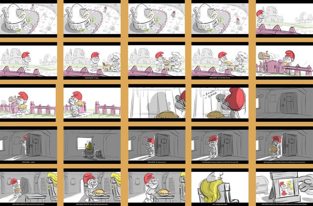Of all the sequences I did on "Smurfs: Lost Village", this one stayed closest to the final film, probably because it was assigned to me late in the production when the overall story was nailed down. Still, I was afforded a lot of leeway when it came to infusing humor and pathos into the pages. For example, I added Papa Smurf bringing Smurfette a Smurfberry Pie as a peace offering. While not in the script, I thought the pie could act as an emotional bribe Papa is employing to say he's sorry. I'm always trying to find those delicate moments where I can weave in a prop or a specific action to punctuate the underlying emotion.