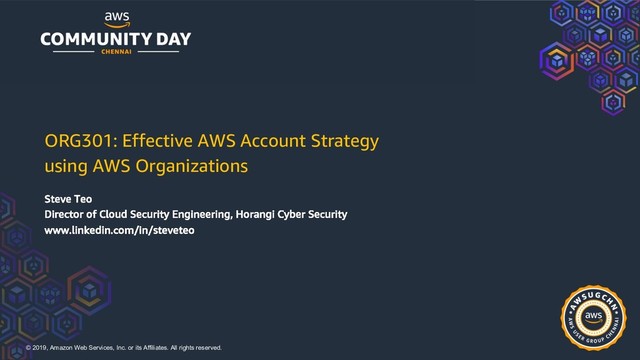 rights reserved. ORG301: Effective AWS Account Strategy using AWS Organizations Steve Teo Director of Cloud Security Engineering, Horangi Cyber Security www.linkedin.com/in/steveteo