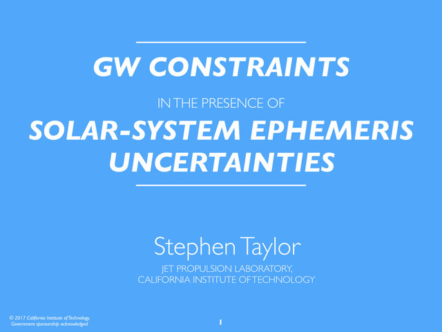 Bayes factor for a common red process (i.e. leaving out H&D correlations) versus noise range from ~1 (DE435) to ~10 (DE430). • It is crucial to marginalize over the difference in the ephemeris uncertainties for robust GW statistics. PRELIMINARY BF ~ 2.5 UL ~ 1.5e-15