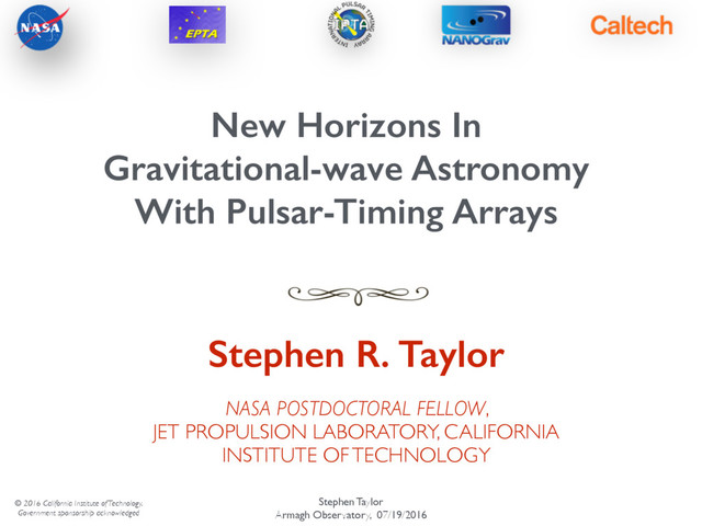 Technology. Government sponsorship acknowledged Stephen R. Taylor New Horizons In Gravitational-wave Astronomy With Pulsar-Timing Arrays NASA POSTDOCTORAL FELLOW, JET PROPULSION LABORATORY, CALIFORNIA INSTITUTE OF TECHNOLOGY