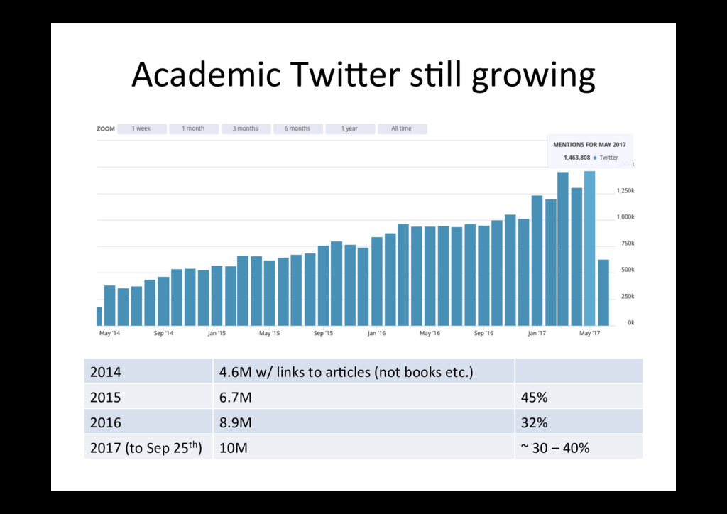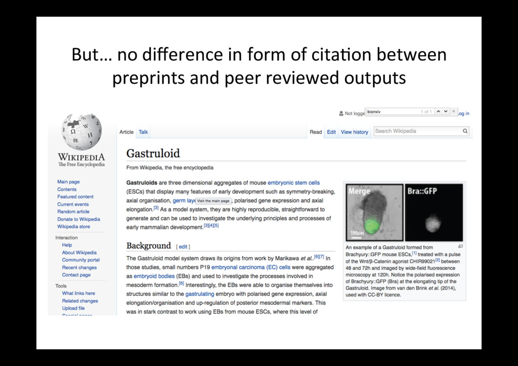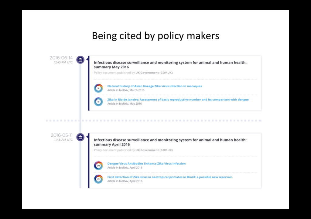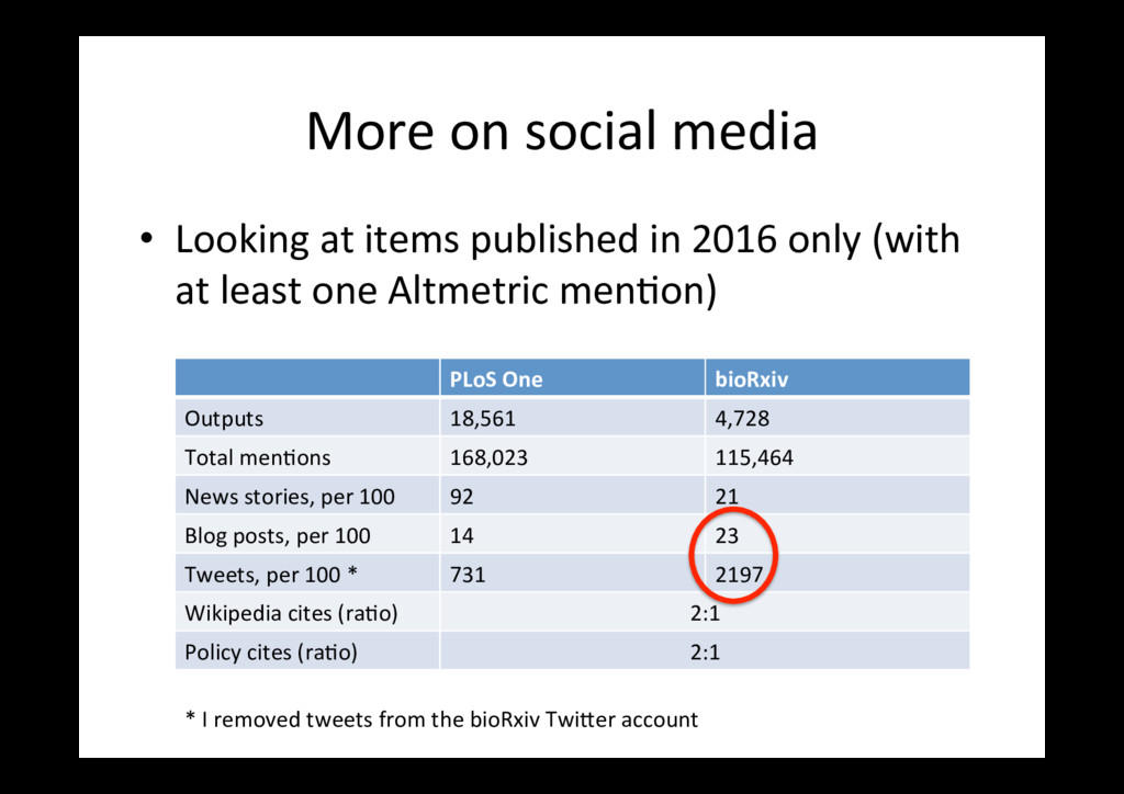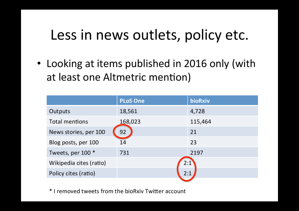 items published in 2016 only (with at least one Altmetric men=on) PLoS One bioRxiv Outputs 18,561 4,728 Total men=ons 168,023 115,464 News stories, per 100 92 21 Blog posts, per 100 14 23 Tweets, per 100 * 731 2197 Wikipedia cites (ra=o) 2:1 Policy cites (ra=o) 2:1 * I removed tweets from the bioRxiv Twi<er account