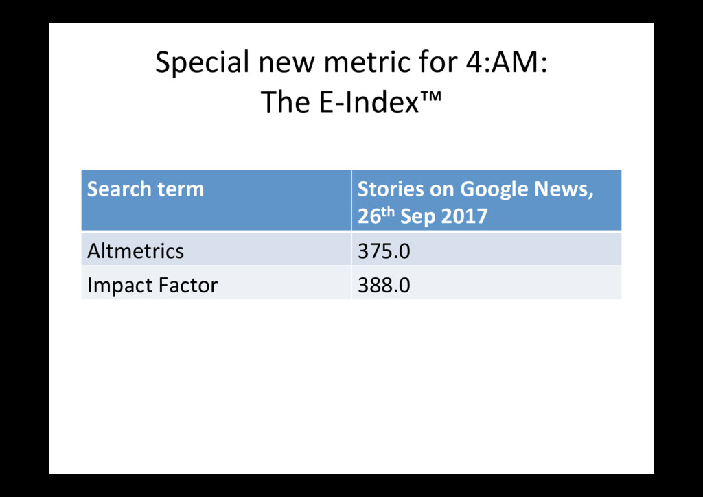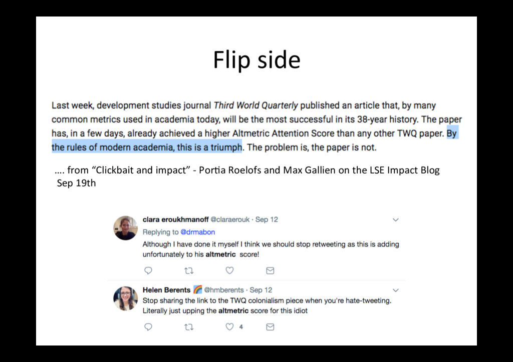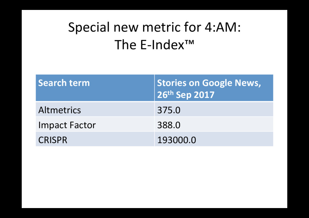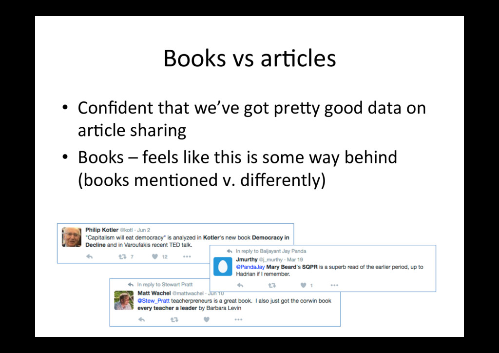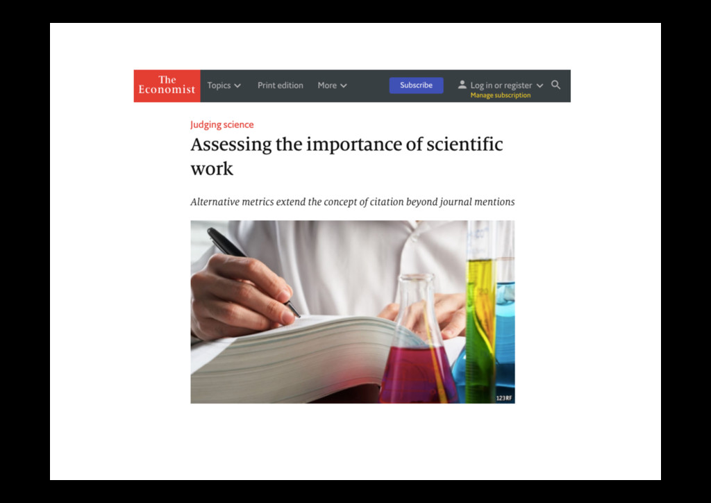 items published in 2016 only (with at least one Altmetric men=on) PLoS One bioRxiv Outputs 18,561 4,728 Total men=ons 168,023 115,464 News stories, per 100 92 21 Blog posts, per 100 14 23 Tweets, per 100 * 731 2197 Wikipedia cites (ra=o) 2:1 Policy cites (ra=o) 2:1 * I removed tweets from the bioRxiv Twi<er account
