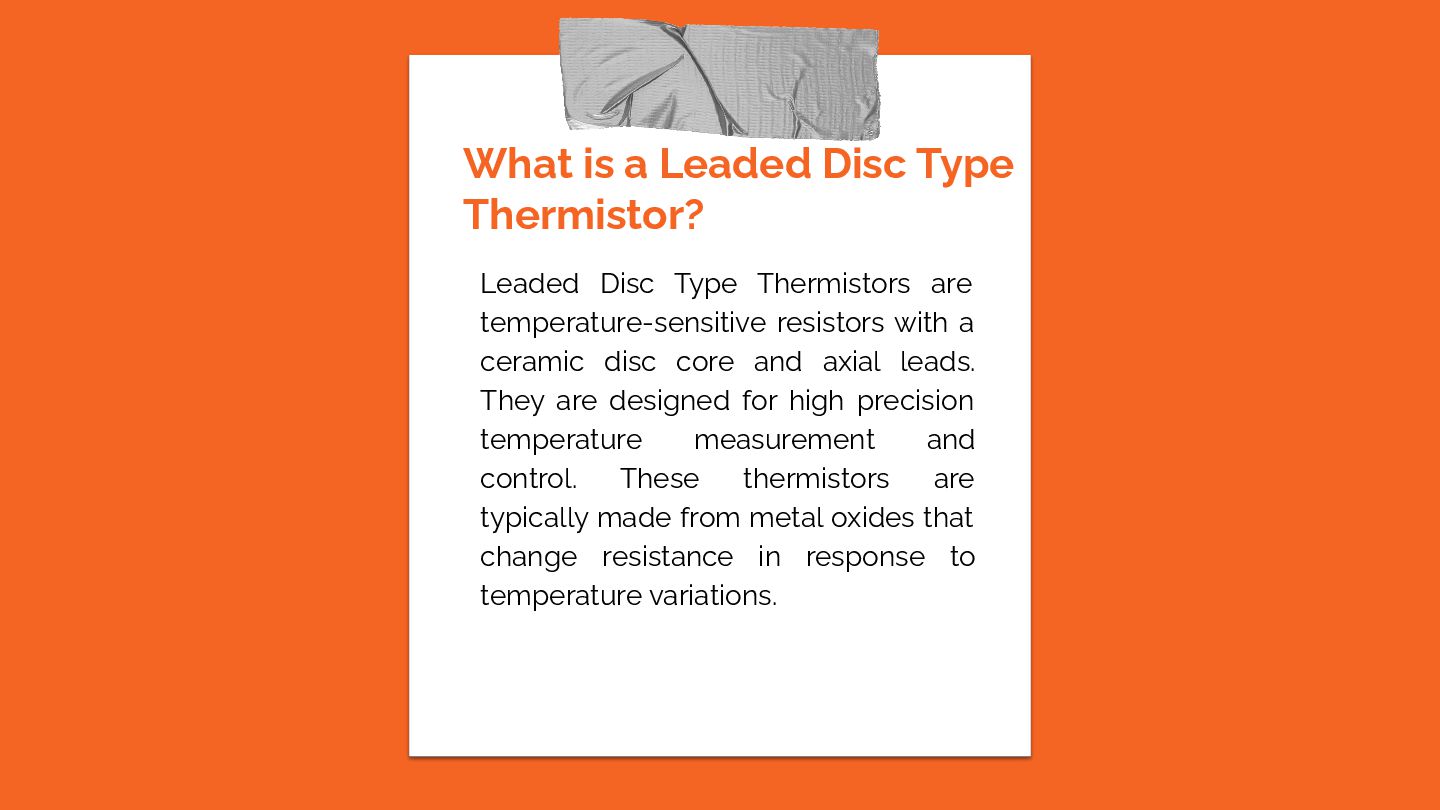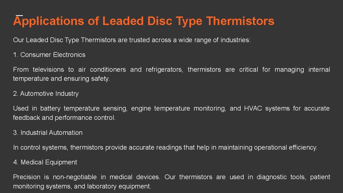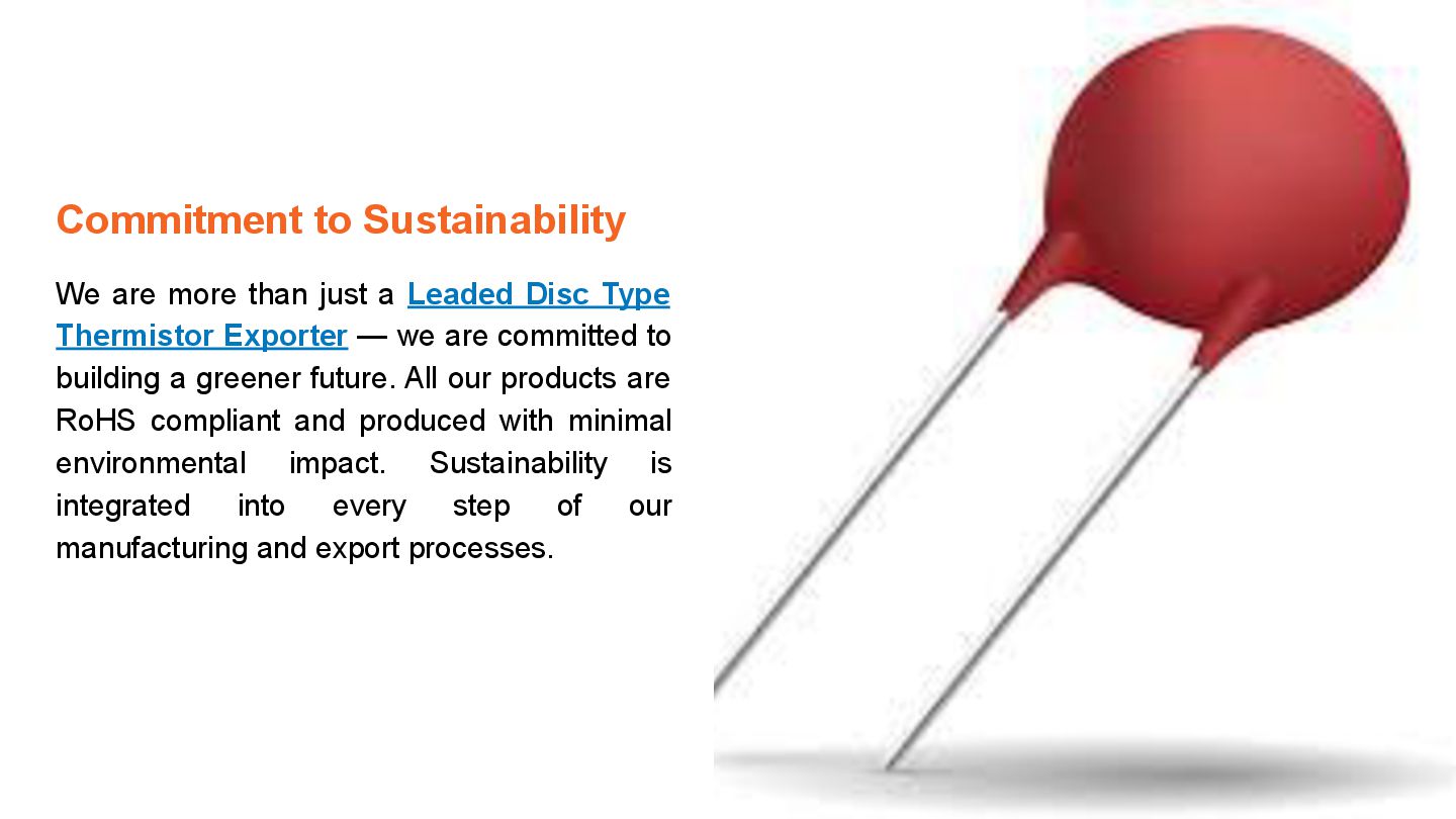We are a trusted Leaded Disc Type Thermistor Exporter, offering high-quality thermistors designed for accurate temperature sensing and control. Our products are known for their reliability, stability, and wide application in electronics, automotive, and industrial systems. With a strong global presence, we ensure timely delivery and competitive pricing to meet diverse customer needs.