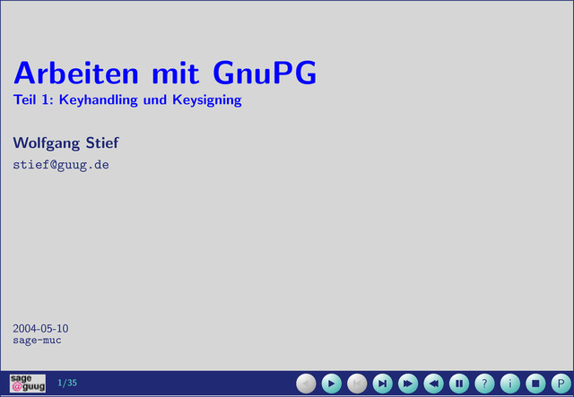 Command Line Tool • Support f¨ ur: FreeBSD (x86), OpenBSD (x86), NetBSD (x86), Windows 95/98/NT/2000/ME PocketConsole (Pocket PC), MacOS X, AIX, BSDI (i386), HP-UX 9-11, Irix, MP-RAS, OSF1, OS/2, SCO UnixWare, SunOS, Solaris (Sparc + x86), USL Unixware • Frontends (GUI): jede Menge, verschiedene OS, Details unter http://www.gnupg.org/ (en)/related_software/frontends.html#gui • F¨ ur viele Mailclients sind Plugins verf¨ ugbar: http://www.gnupg.org/(en)/related_ software/frontends.html#mua • Vergleich und Stolperfallen: iX 3/2004, S. 126 ff.