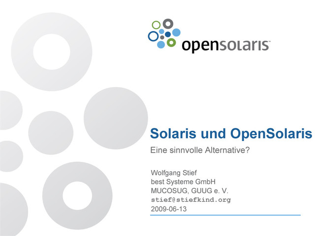 Community in Deutschland Deutsches Portal http://de.opensolaris.org/ OpenSolaris Developer Conference http://www.osdevcon.org/ User Groups in München, Hamburg, Berlin, Osnabrück, Rhein-Neckar Munich OpenSolaris User Group http://www.mucosug.org/ 24. Juni, Hochschule München News in OSOL 2009.06