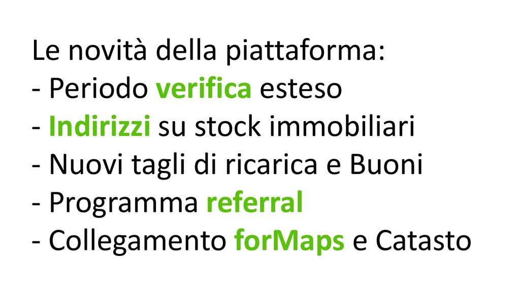 Scopri con noi tutte le novità della piattaforma: - Nuovi tagli di ricarica - Buoni - Indirizzi su stock immobiliari - Collegamento formaps e Catasto - Nuovo sistema di allargamento automatico del periodo di verifica - Programma referral