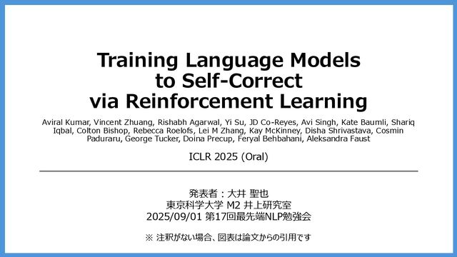 Avi Singh, Kate Baumli, Shariq Iqbal, Colton Bishop, Rebecca Roelofs, Lei M Zhang, Kay McKinney, Disha Shrivastava, Cosmin Paduraru, George Tucker, Doina Precup, Feryal Behbahani, Aleksandra Faust Training Language Models to Self-Correct via Reinforcement Learning ICLR 2025 (Oral) 発表者:大井 聖也 東京科学大学 M2 井上研究室 2025/09/01 第17回最先端NLP勉強会 ※ 注釈がない場合、図表は論文からの引用です