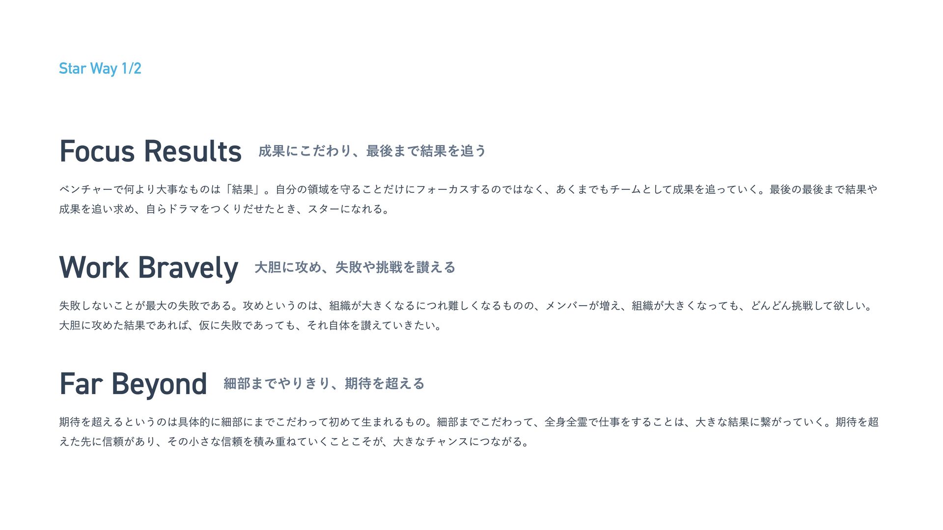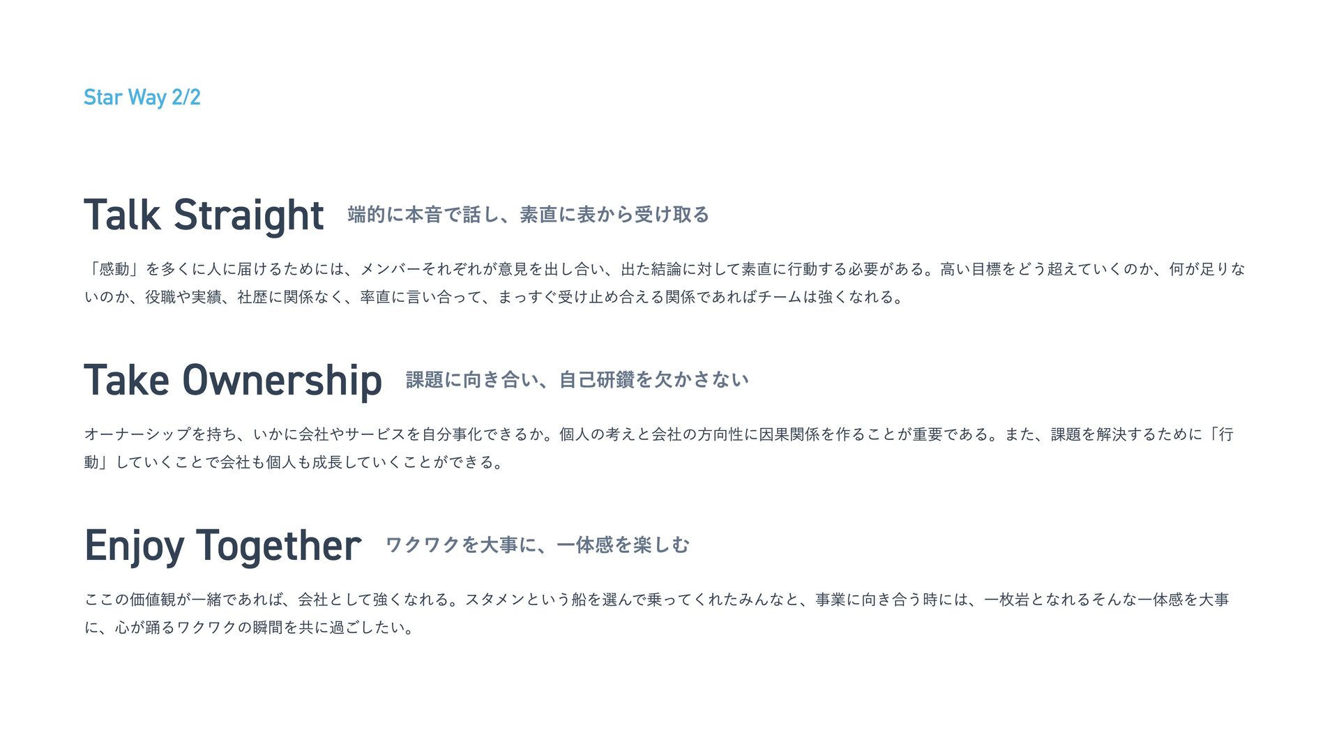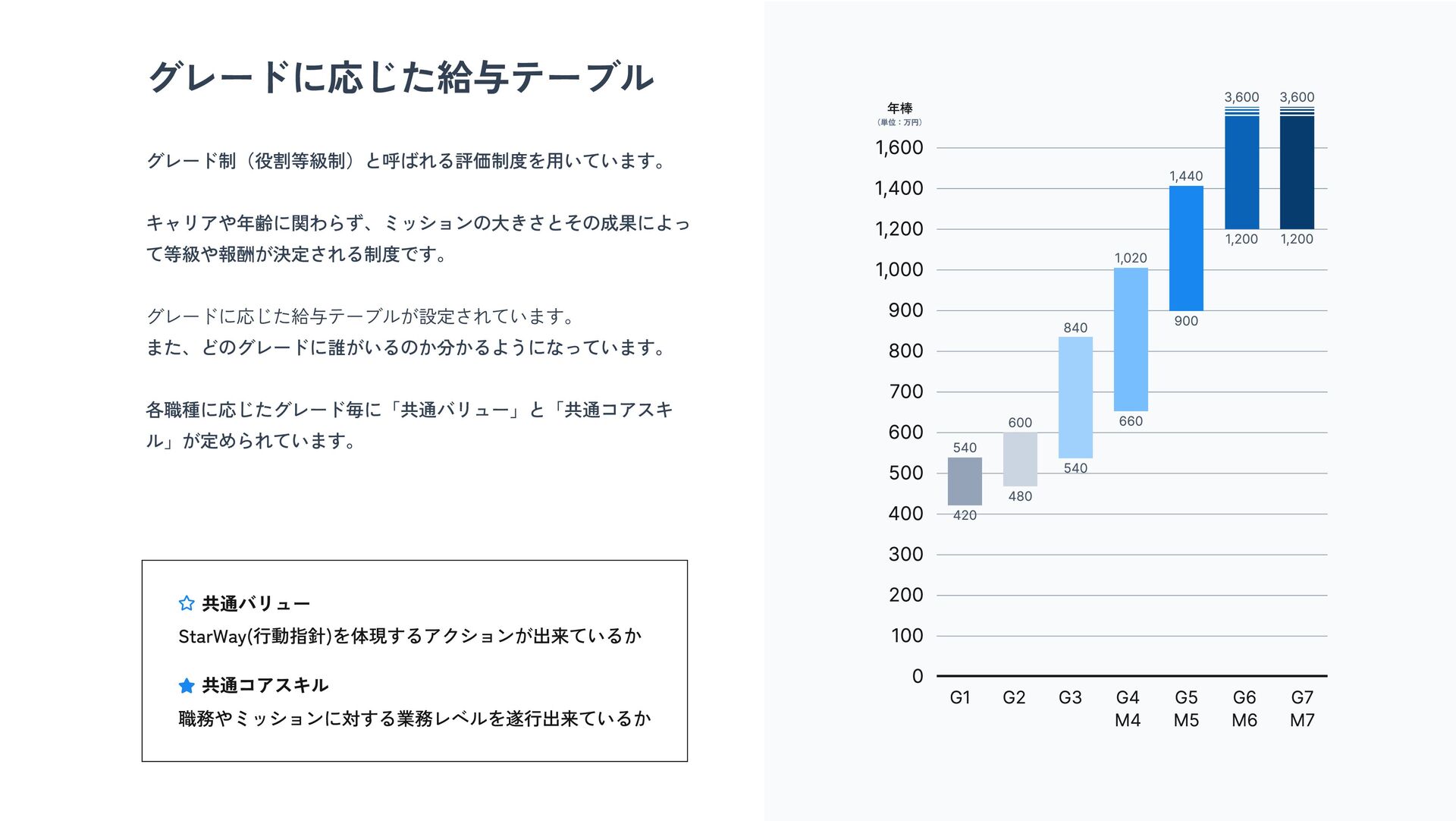 還元活動を積極的に行っています。 また、イベントの開催によって社内で持つスキルの発信 や、エンジニアの登壇機会の創出ができるよう取り組んで います。 他 Kaigi on Rails, try Swift! Tokyo など 社内外問わずエンジニアのスキル向上や、コミュニティの活性化を目的とした カンファレンスや技術コミュニティへの継続的な支援を行っています。 グレードに応じた給与テーブル グレード制(役割等級制)と呼ばれる評価制度を用いています。 キャリアや年齢に関わらず、ミッションの大きさとその成果によっ て等級や報酬が決定される制度です。 グレードに応じた給与テーブルが設定されています。 また、どのグレードに誰がいるのか分かるようになっています。 各職種に応じたグレード毎に「共通バリュー」と「共通コアスキ ル」が定められています。 共通バリュー StarWay(行動指針)を体現するアクションが出来ているか 共通コアスキル 職務やミッションに対する業務レベルを遂行出来ているか G1 G2 G3 G4 M4 G5 M5 G6 M6 G7 M7 1,600 1,400 1,200 1,000 900 800 700 600 500 400 300 200 100 0 840 年棒 (単位:万円) 540 1,020 660 1,440 900 3,600 1,200 3,600 1,200 540 420 600 480